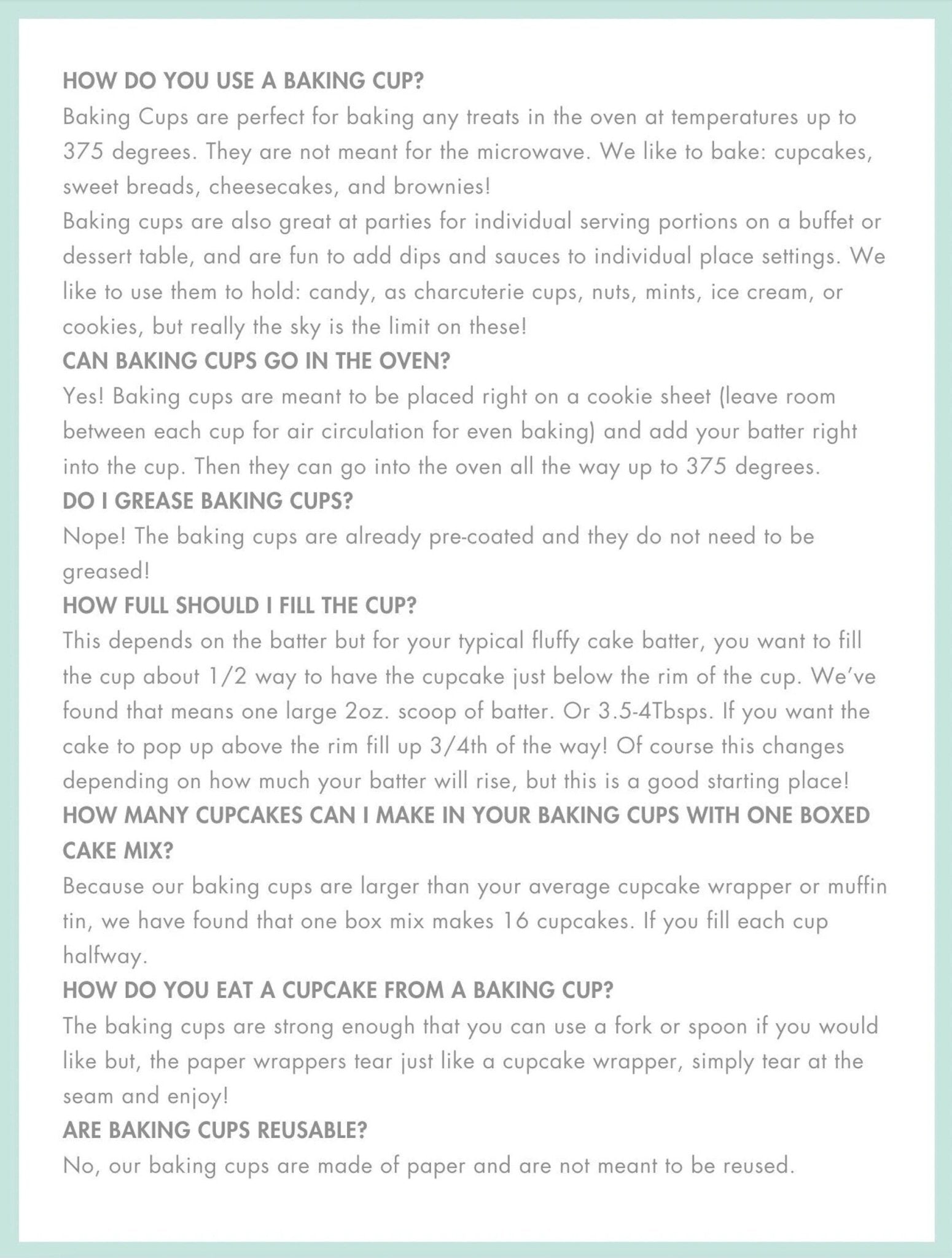 Recommendation if baking: Fill cup half way, place cups on baking tray. Oven safe to 375 degrees Fahrenheit.