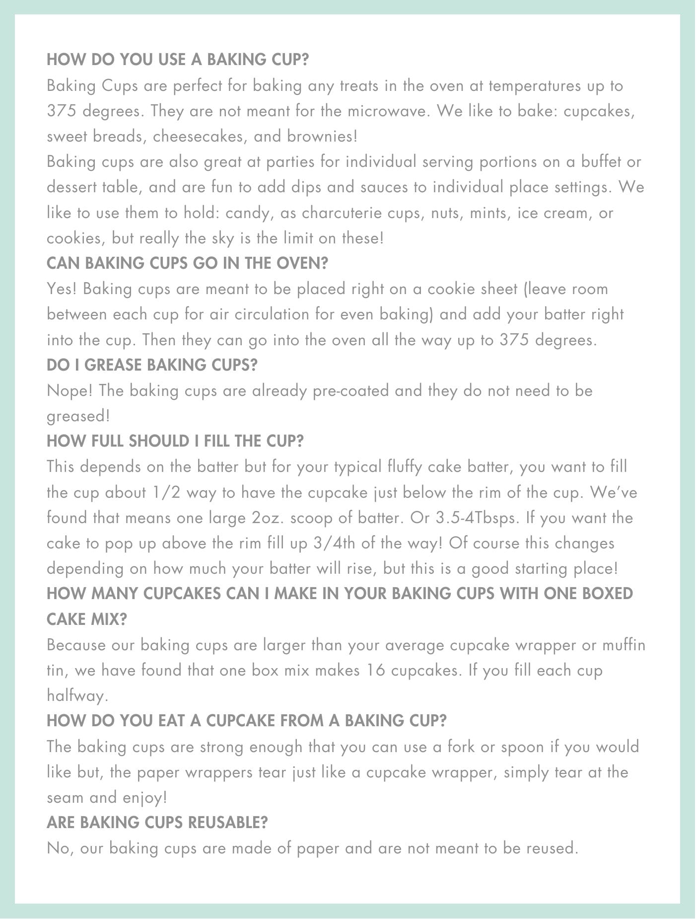 Use these cups to bake cupcakes, small pies, mini cheesecakes, mini quiches, or muffins! Or use them to hold nuts, candies, dips, snacks, cookies, or ice cream. Recommendation if baking: Fill cup halfway, place cups on baking tray. Oven safe to 375 degrees Fahrenheit. Do not microwave. Keep away from open flames.