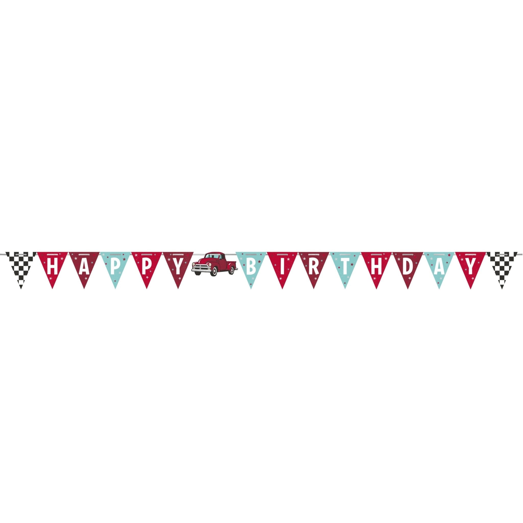 Add vintage flair to your party setup with this red truck "Happy Birthday" banner! Featuring triangle-shaped pennants in red and blue, checkered flags, and a retro pickup truck cutout, this paper garland is perfect for race car themes, truck parties, or vehicle themed celebrations. Lightweight and ready to hang for instant impact.