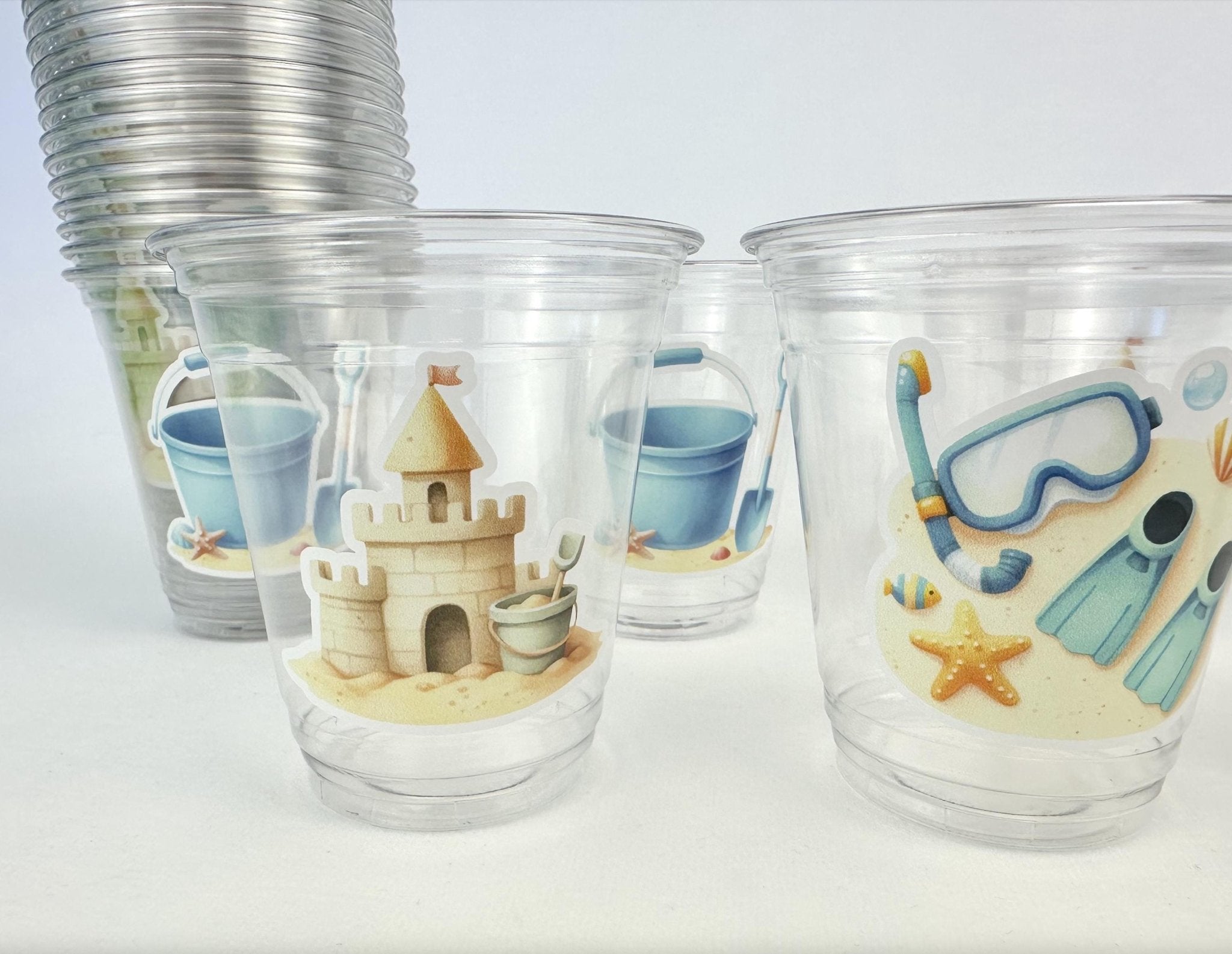 Bring the beach to your party with these fun 12oz plastic cups featuring adorable beach-themed designs! These cup showcase playful illustrations like a sandcastle, bucket and shovel, snorkel gear, and more. Perfect for summer birthdays, poolside celebrations, or ocean-themed events. Optional lids available for spill-free fun!