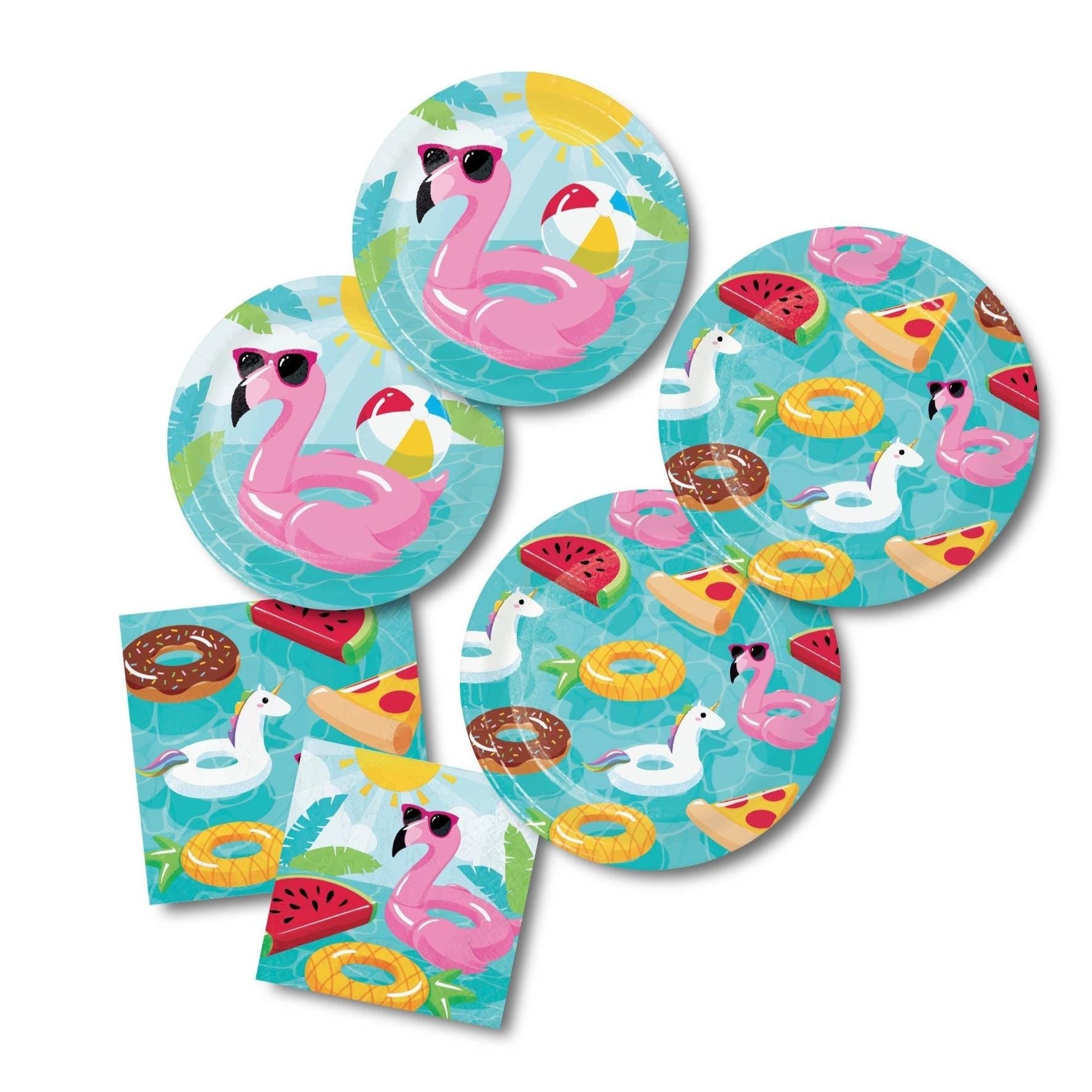 Make a splash with this fun and floaty party set! Featuring flamingos, unicorns, pizza, donuts, beach balls, fruit and more, this colorful bundle includes all the essentials to serve 16 guests. Perfect for summer birthdays, pool parties, or any tropical-themed celebration!
