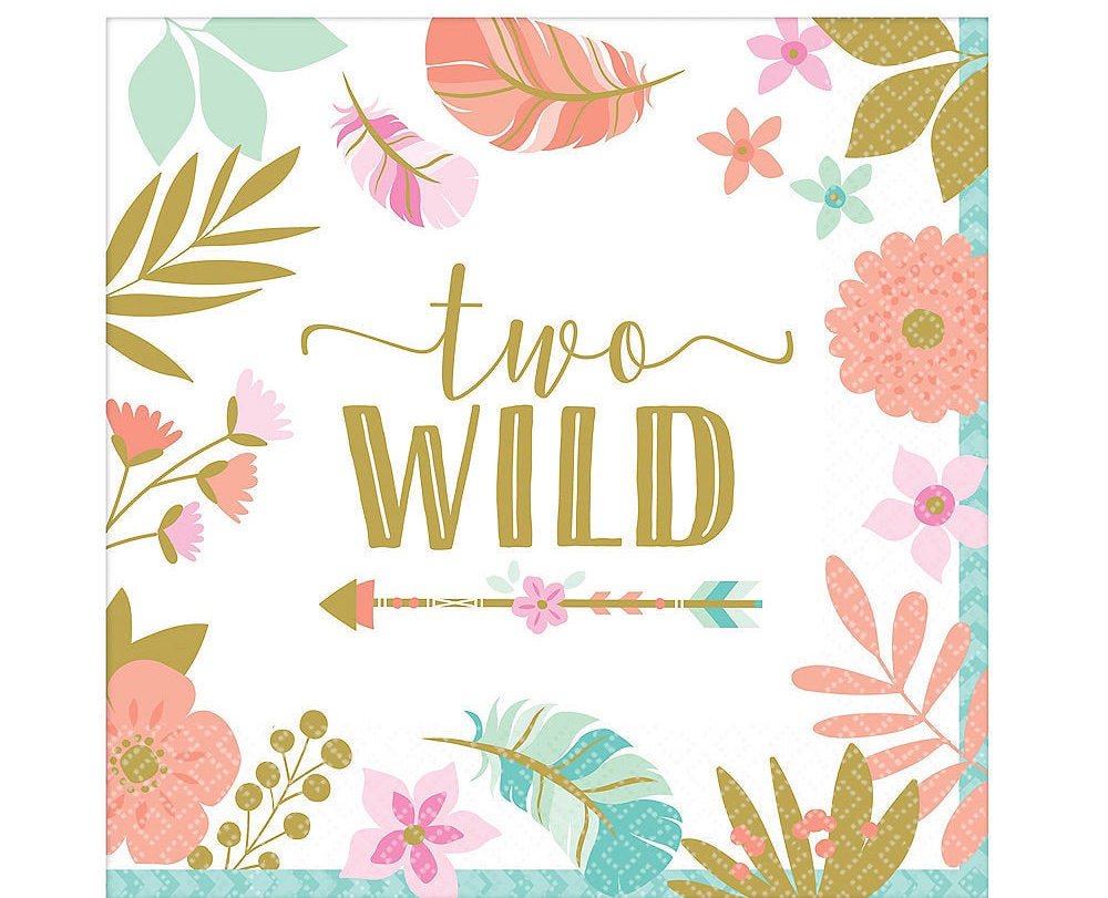 These "two wild" napkins are perfect for serving up treats at your bohemian themed second birthday! Pink, coral, gold and mint tones are set in a beautiful boho floral design with a hint of tribal accents. Luncheon sized, and perfect for a full meal or just snacks and dessert!