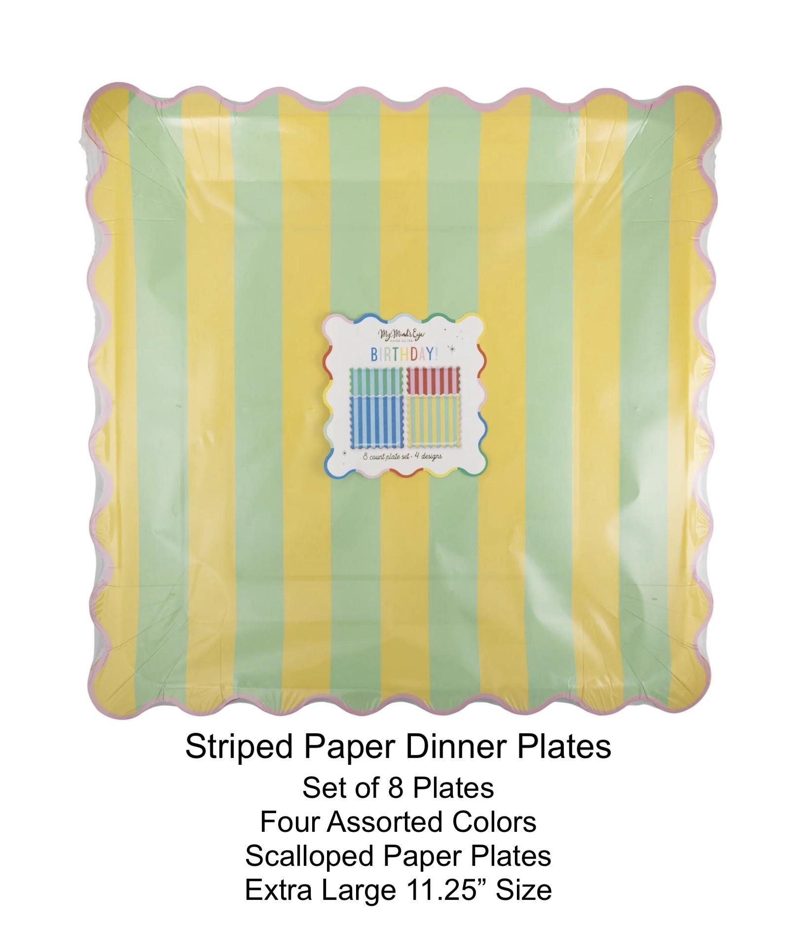 Brighten up your celebration with these Striped Rainbow Party Plates! These square paper plates feature elegant scalloped edges and come in four vibrant stripe designs in a mixture of colors including green, yellow, blue, red and pink. Perfect for birthdays, rainbow-themed parties, baby showers, fiesta celebrations, graduation parties, summer picnics, or any cheerful gathering, these large disposable plates add a colorful touch to your table setting.