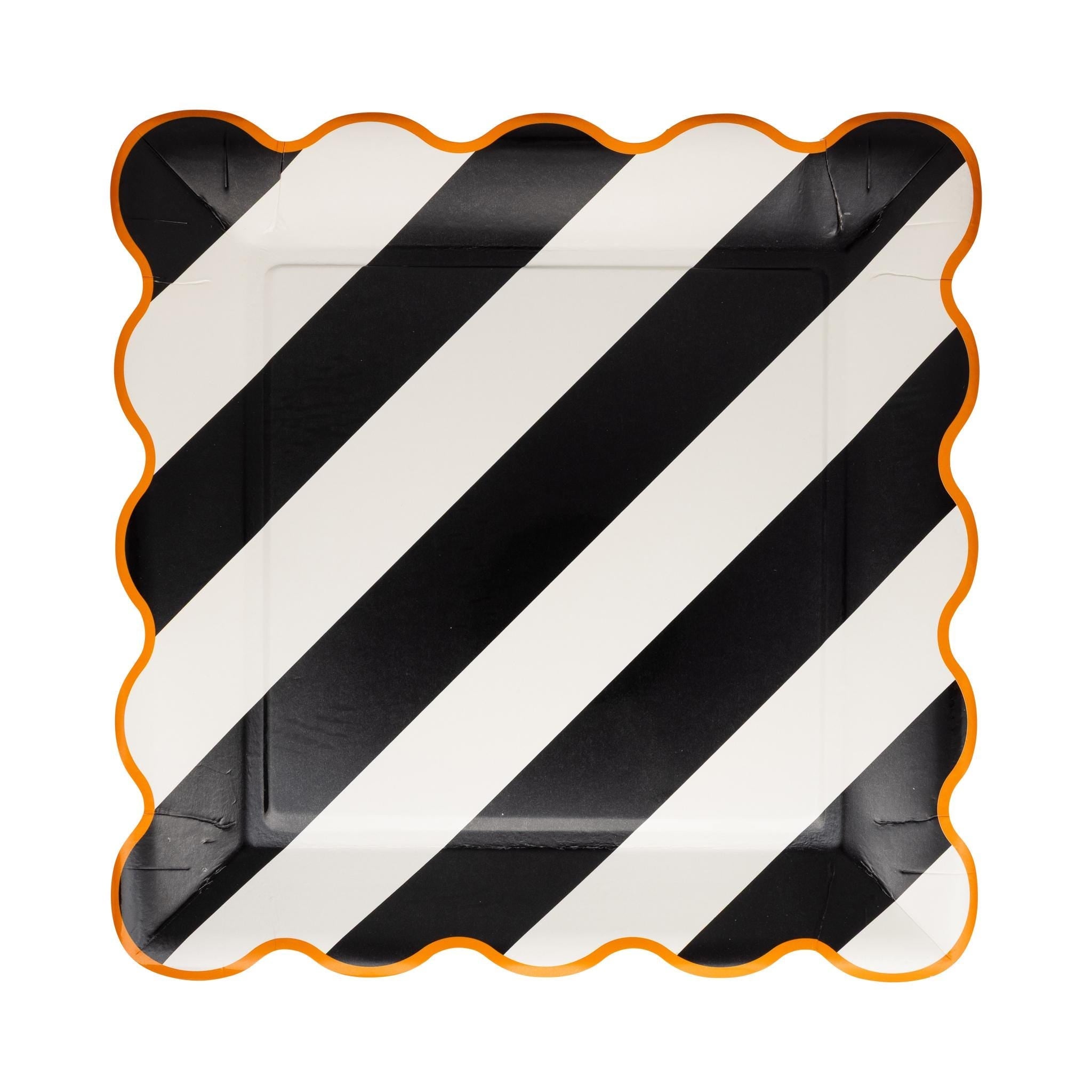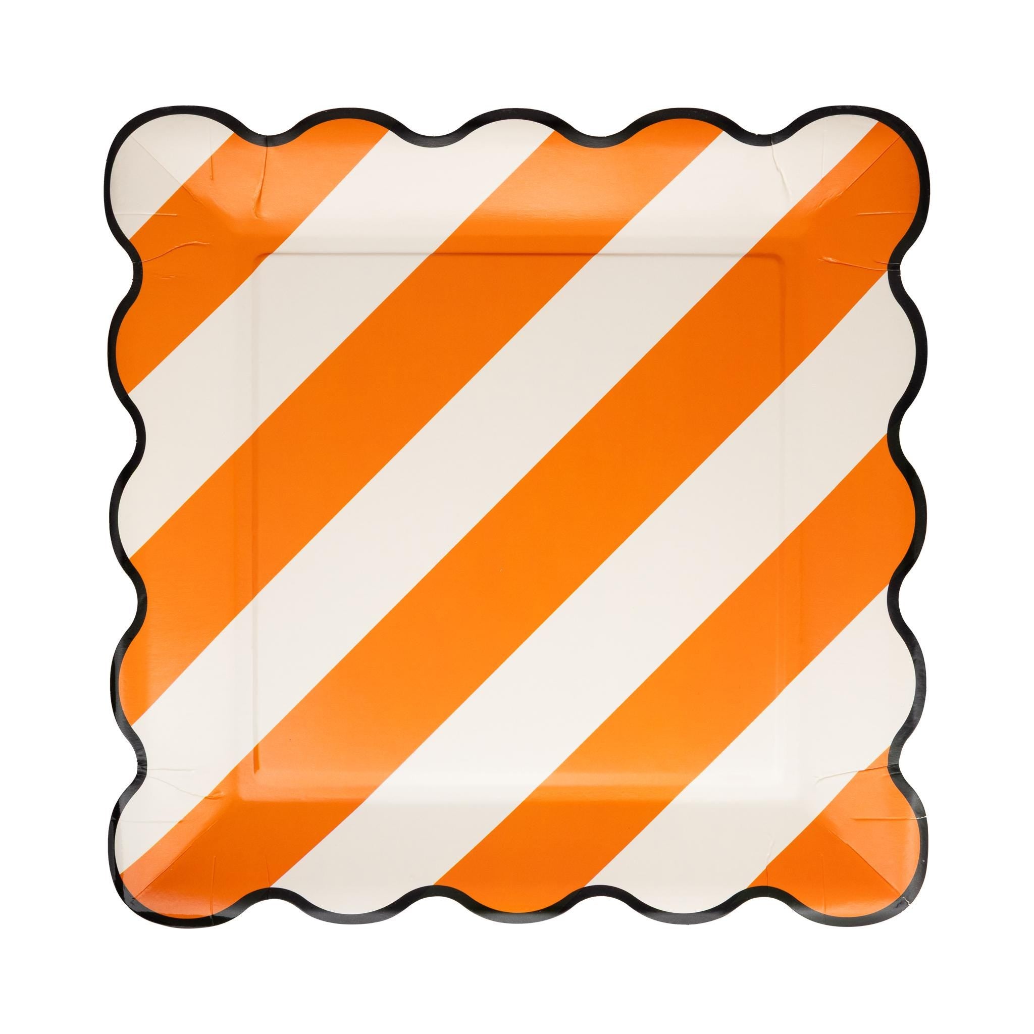 Serve up festive fun with these bold striped paper plates! Each pack includes 8 scalloped 10-inch plates in two assorted designs: black and white stripes with an orange border, and orange and white stripes with a black border. Perfect for Halloween celebrations, construction-themed birthdays, or any party that calls for striking style. Made of sturdy disposable paper for easy cleanup.