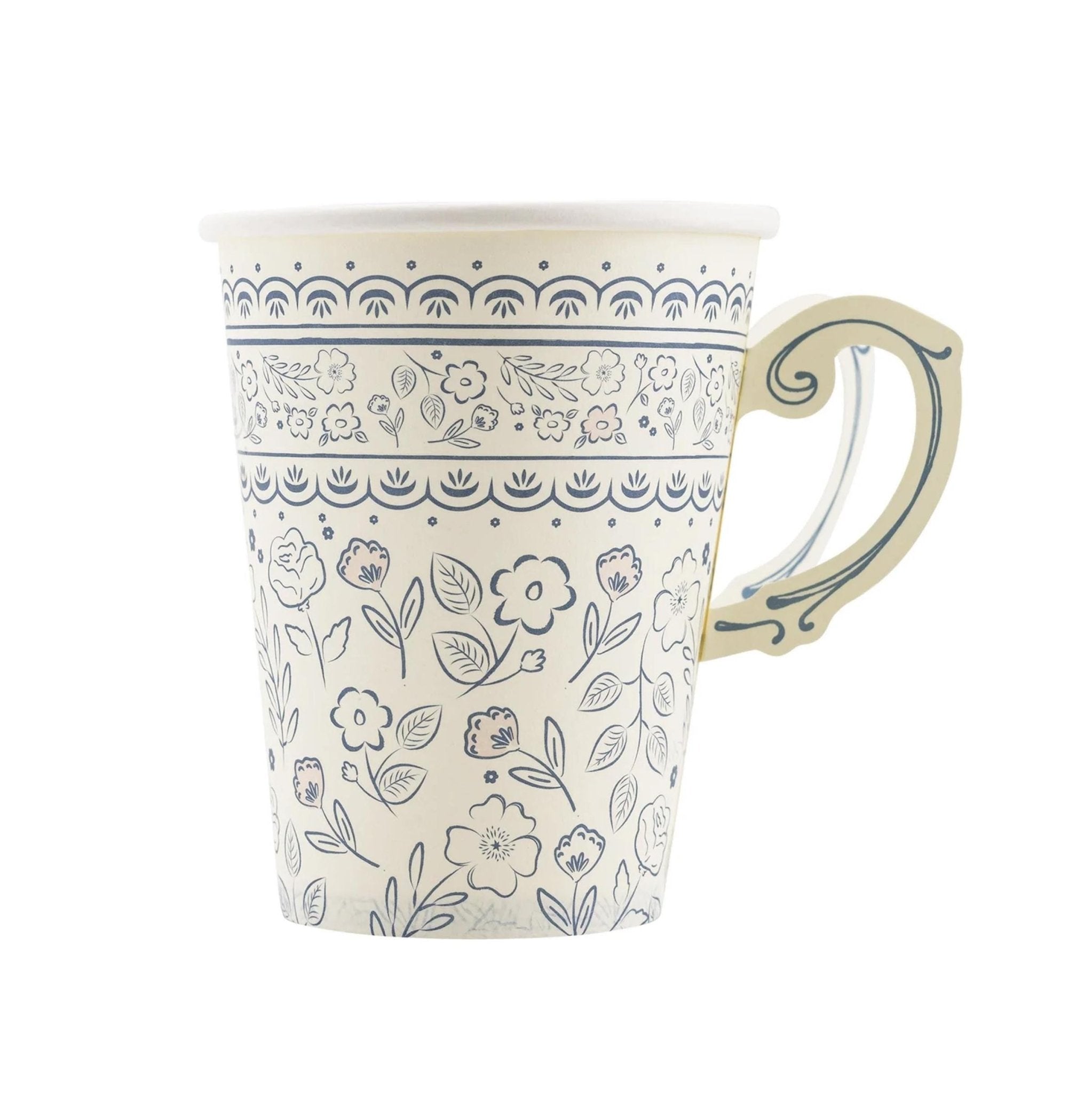 Elevate your beverage service with these Blue Floral Party Cups featuring a charming blue toile pattern and unique paper handles. These paper cups blend elegance and functionality, making them perfect for tea parties, bridal showers, or sophisticated gatherings. The intricate floral design adds a timeless touch, while ensuring easy use for drinks. Add a touch of refinement to your party setup with these stylish and practical cups!