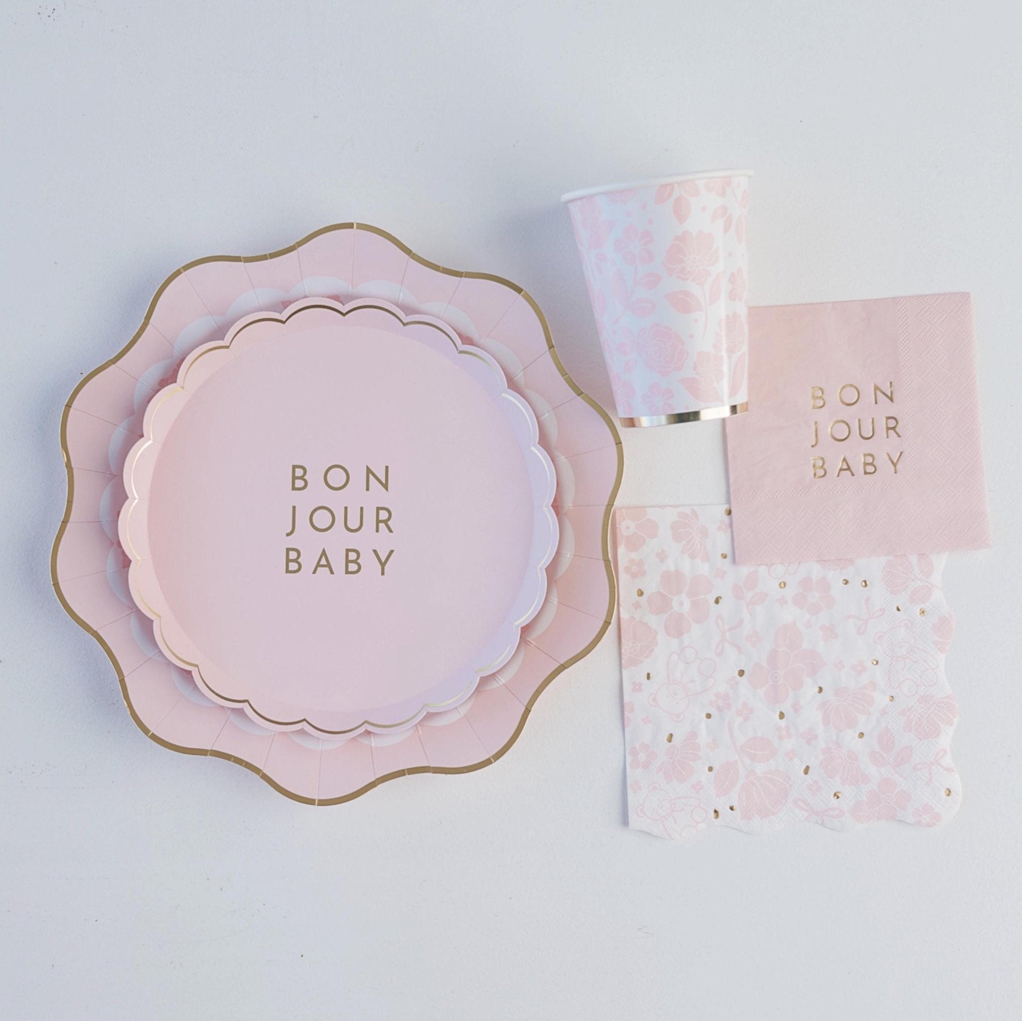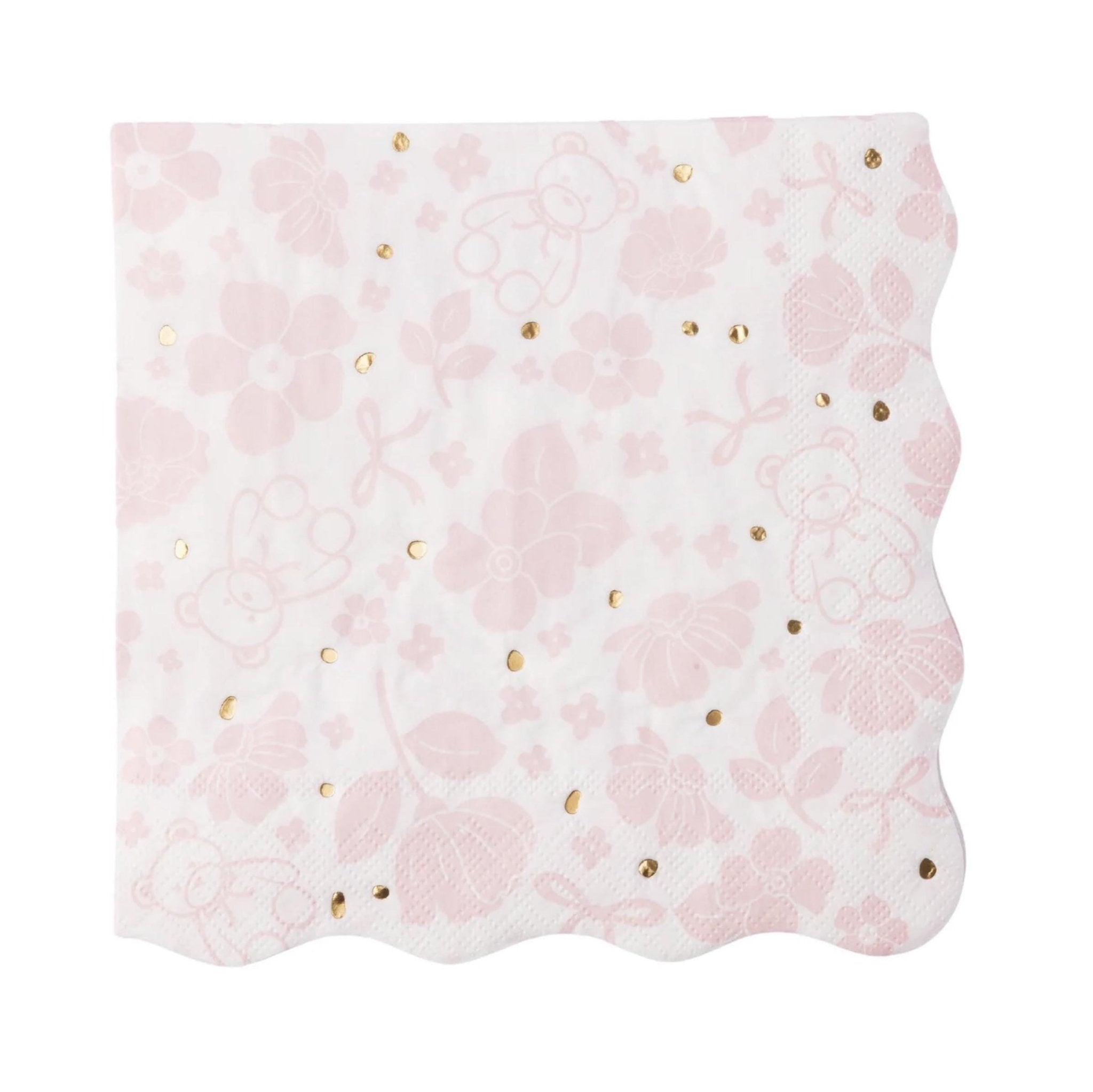 Add a charming touch to your celebration with these Pink Floral Teddy Bear Napkins! Featuring adorable teddy bears wearing pink bows, these white scalloped paper napkins are beautifully decorated with pink flowers and accented with gold foil dots for an extra elegant touch. Perfect for baby showers, first birthdays, gender reveal parties, and sweet celebrations!
