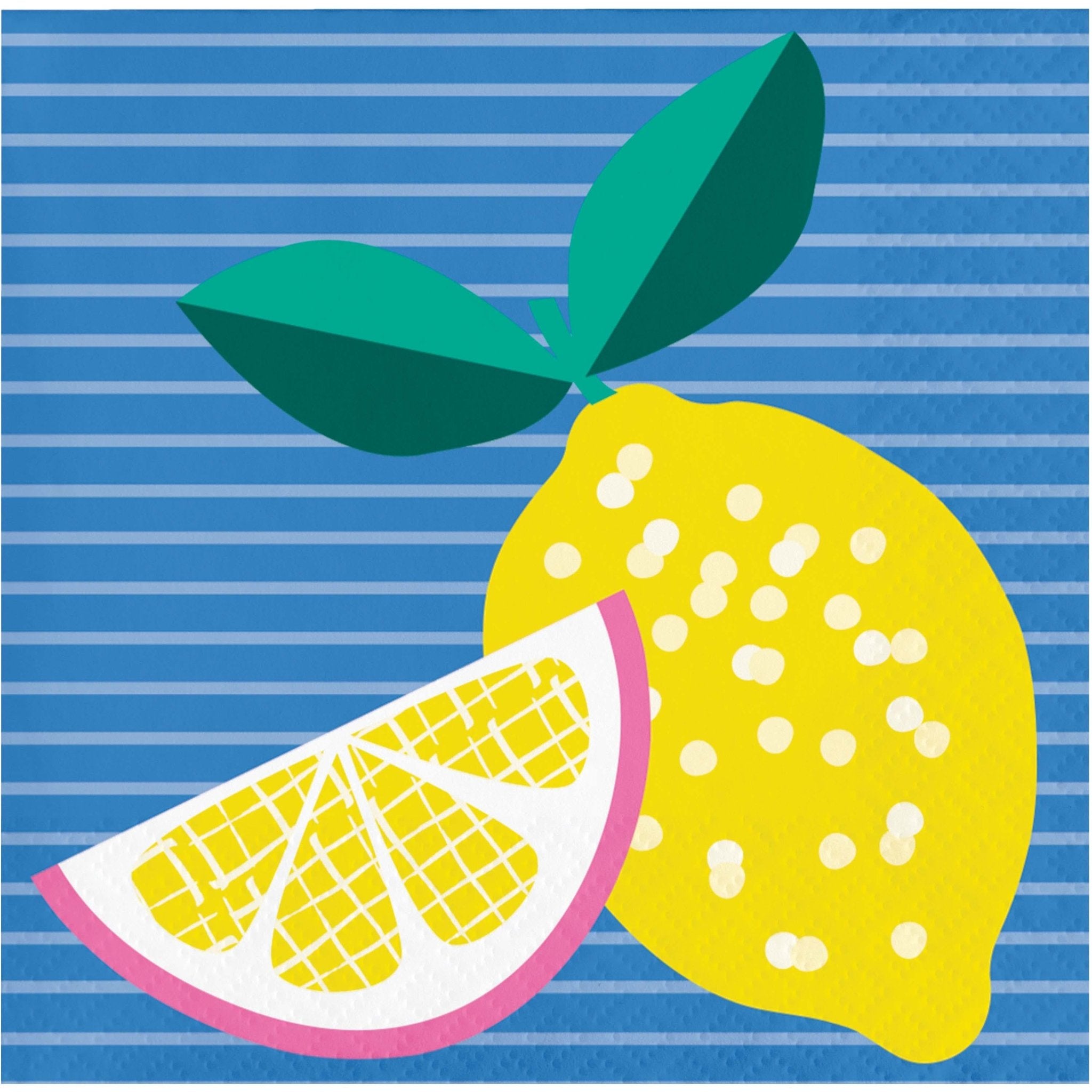 Brighten up your table with our Lemon Party Napkins, featuring a vibrant lemon with green leaves and a juicy pink lemon slice against a cheerful blue striped background. Perfect for summer gatherings, garden parties, or citrus-themed events, these beverage napkins add a fresh and sunny touch to your table decor.
