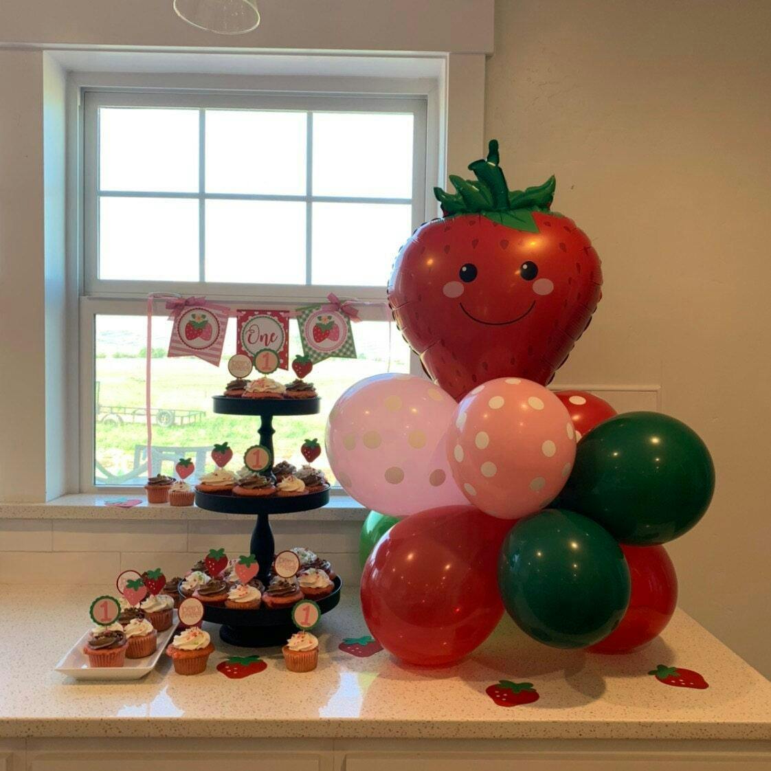 Create a fun party atmosphere with this cute smiling strawberry balloon! It will be a cheery addition to your fruit birthday, strawberry party, or farmers market birthday decorations.