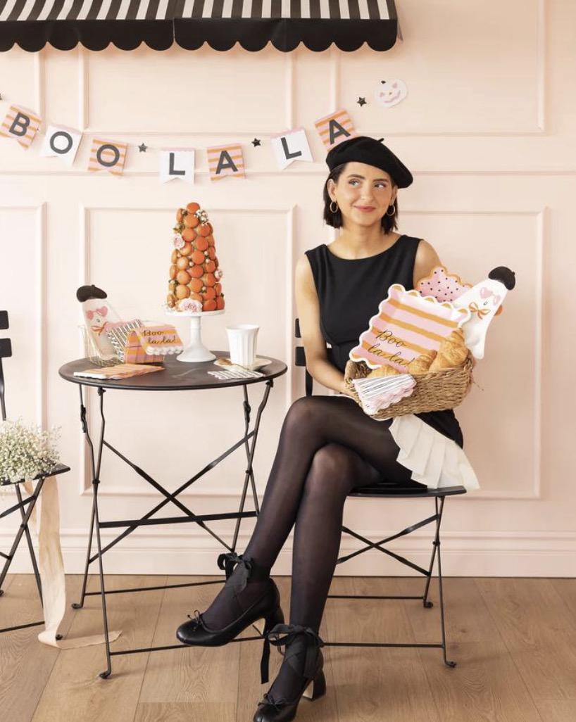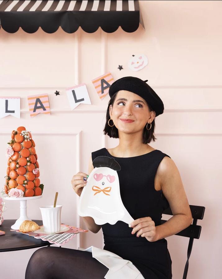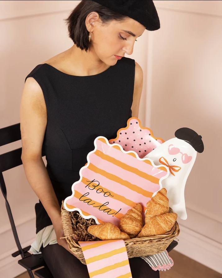 Say Boo La La! with these chic ghost-shaped Halloween plates! Designed with pink heart sunglasses, a Parisian beret, and a sweet orange bow, these plates bring a stylish French twist to your spooky celebrations.