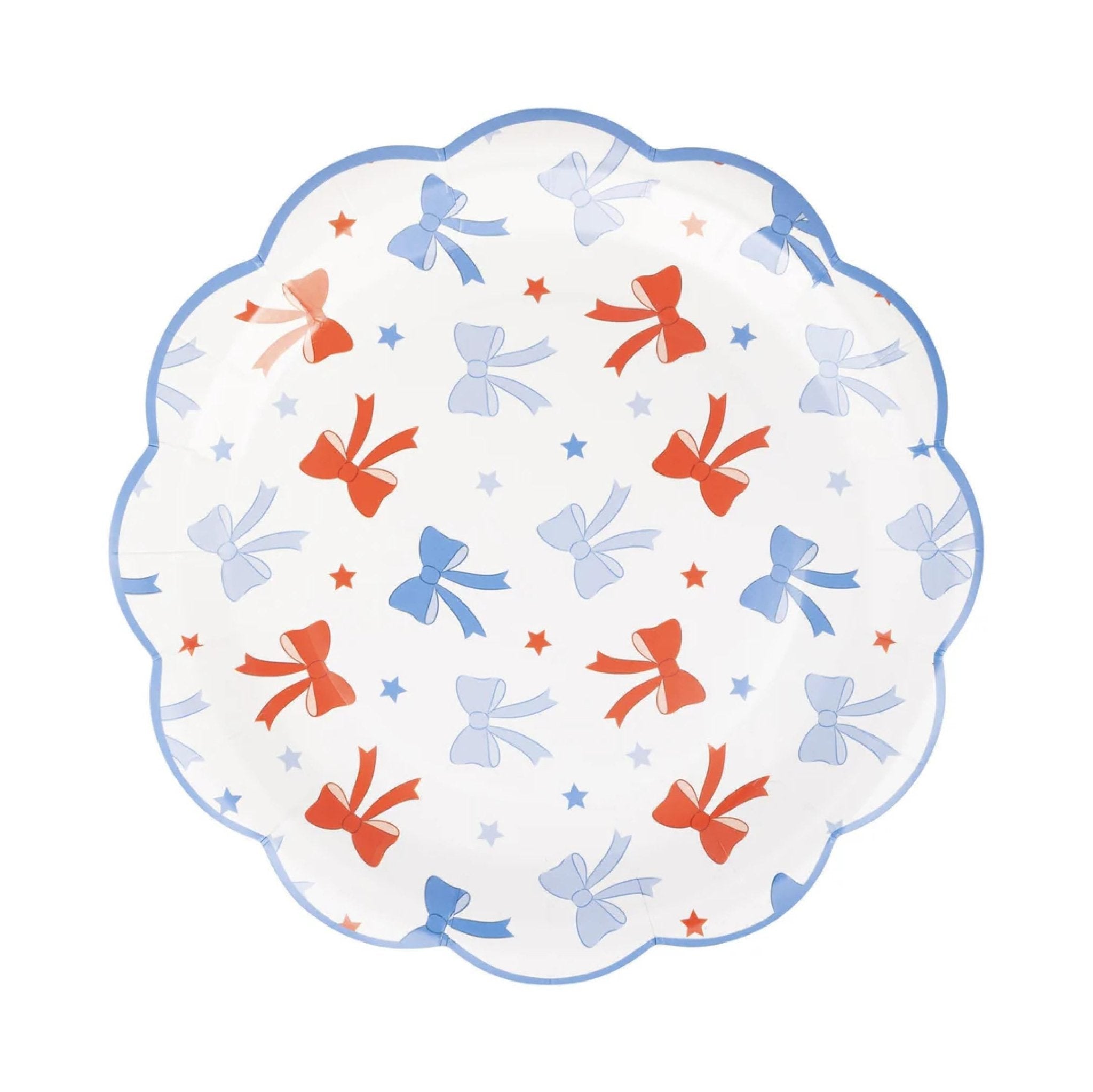 Add a festive pop to your patriotic party with these charming coquette bow dinner plates! Featuring scalloped edges and a red, white, and blue color scheme, they're perfect for 4th of July celebrations, summer birthdays, baby showers, and family BBQs.