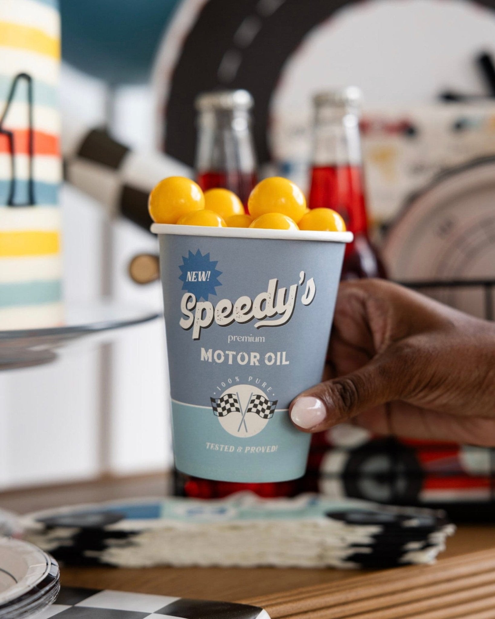 Rev up the fun at your next celebration with our Speedway Party Cups! Featuring a bold checkered flag design and a "Premium Motor Oil" emblem, these cups bring the thrill of the racetrack to your party. Perfect for racing fans, car enthusiasts, or any motorsport-themed event, these paper cups are as stylish as they are functional. Whether it's a birthday bash, race day gathering, or themed party, these cups are sure to fuel the excitement and keep your guests engaged throughout the celebration!