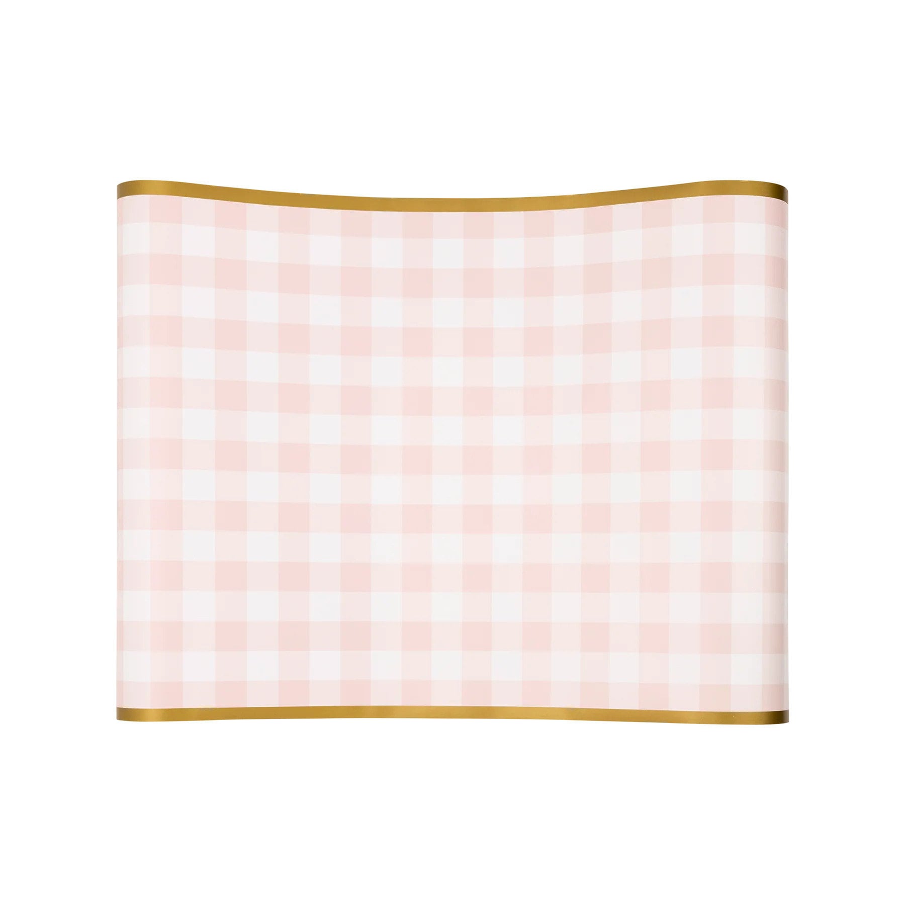 Elevate your table decor with our Pink Gingham and Gold Table Runner, blending whimsical charm with refined elegance. The classic pink gingham pattern is complemented by a shimmering gold foil edge, creating a captivating look for any celebration. Perfect for birthday parties, baby showers, springtime brunches, or afternoon tea parties, this versatile paper table runner effortlessly enhances your table setting. Add a dash of sophistication to your special occasion with this delightful party accessory.