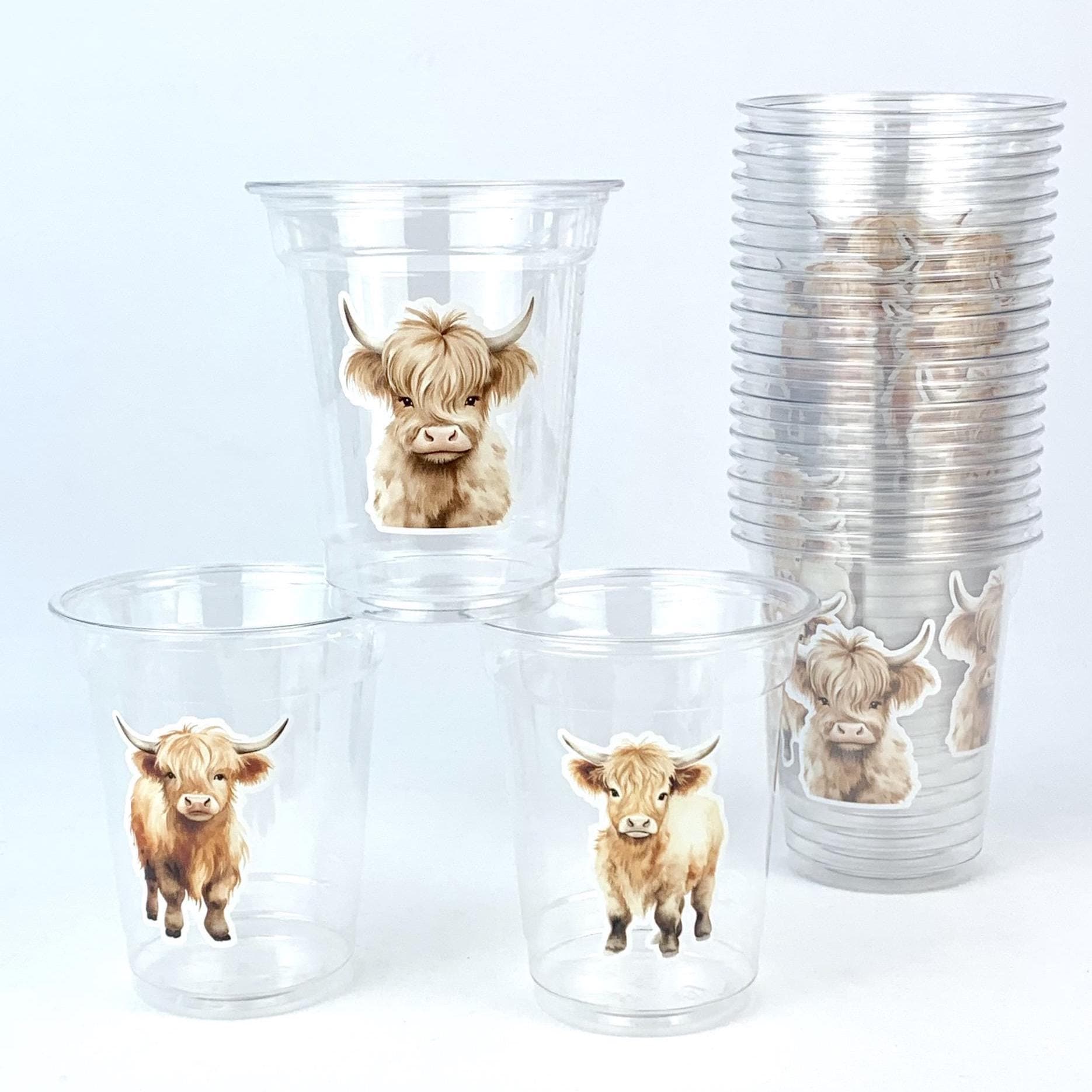 Serve up some rustic charm with these adorable Highland Cow party cups! Each 12oz clear plastic cup features assorted watercolor-style cow decals, perfect for baby showers, kids' birthdays, farm-themed celebrations, or even adult barnyard bashes. Durable, disposable, and cute enough to moo about!
