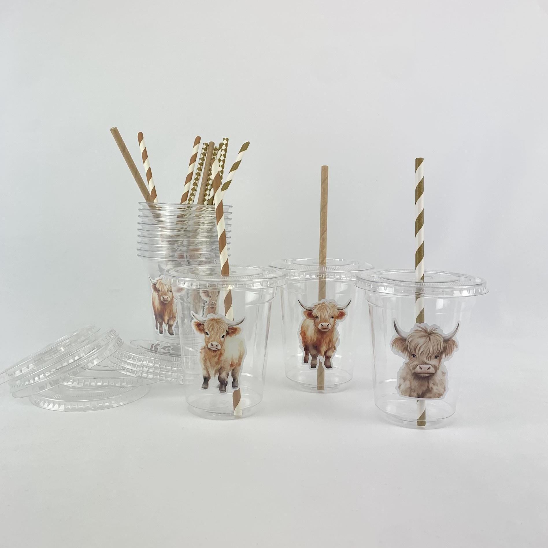Bring rustic charm to your celebration with these Highland Cow Party Cups! These clear soft plastic cups feature adorable highland cow designs that add a whimsical, countryside vibe to any gathering. Each cup comes with a coordinating paper straw and plastic lid, making them perfect for serving drinks in style. Ideal for farm-themed parties, cow baby showers, bridal showers, or rustic celebrations, these cups combine practicality with playful design. Delight your guests with these unique and charming highland cow cups!