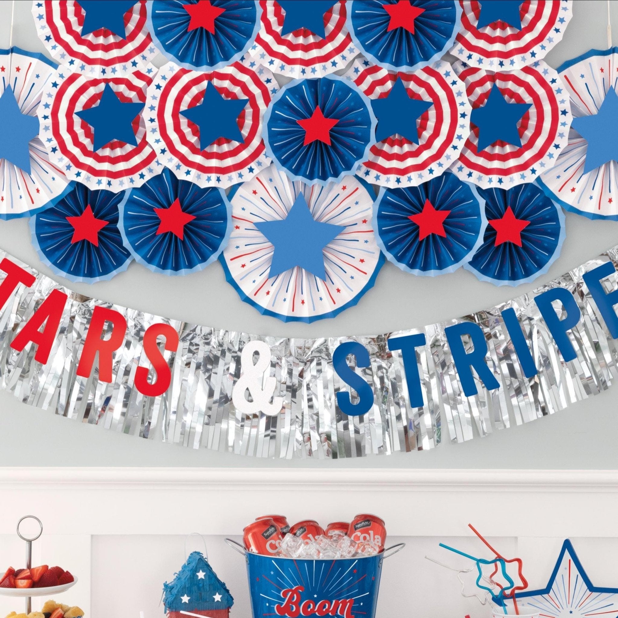 Add instant flair to your patriotic party with these red, white, and blue paper fan decorations! This 5-piece set includes starburst designs in assorted sizes with bold stars and stripes, perfect for hanging above party tables, entryways, or as a festive backdrop. Lightweight, easy to hang, and full of USA spirit!