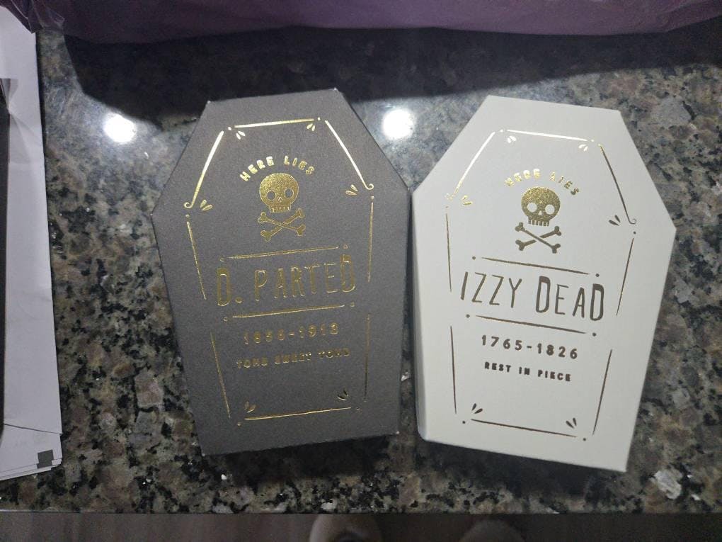 Add a spooky twist to your Halloween festivities with our Halloween Coffin Treat Boxes! Designed to resemble tombstones, these playful paper favor boxes feature amusing and eerie phrases like "Dee Cayen," "D. Parted," and "Ima Goner," guaranteed to bring a smile to your guests' faces. Sturdy and disposable, these boxes not only keep your treats secure but also add a fun, haunting vibe to your party decor. Perfect for filling with candies, snacks, or party favors, these coffin-shaped treat boxes are sure to be a hit at any Halloween celebration!