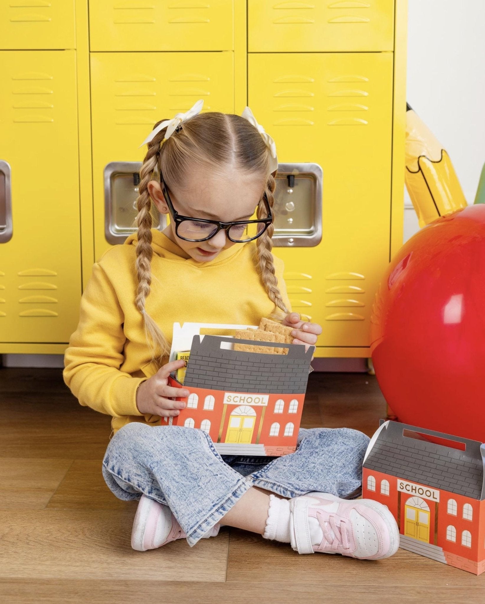 Make your back to school or classroom party extra special with this charming set of 8 school house treat boxes! Each gable-style box measures 7" x 2.5" x 5.5" and features bright red walls, a yellow door, a gray roof with a convenient handle, and gold foil accents. Perfect for party favors, snacks, or small gifts, these boxes add a festive and fun touch to any school-themed celebration.