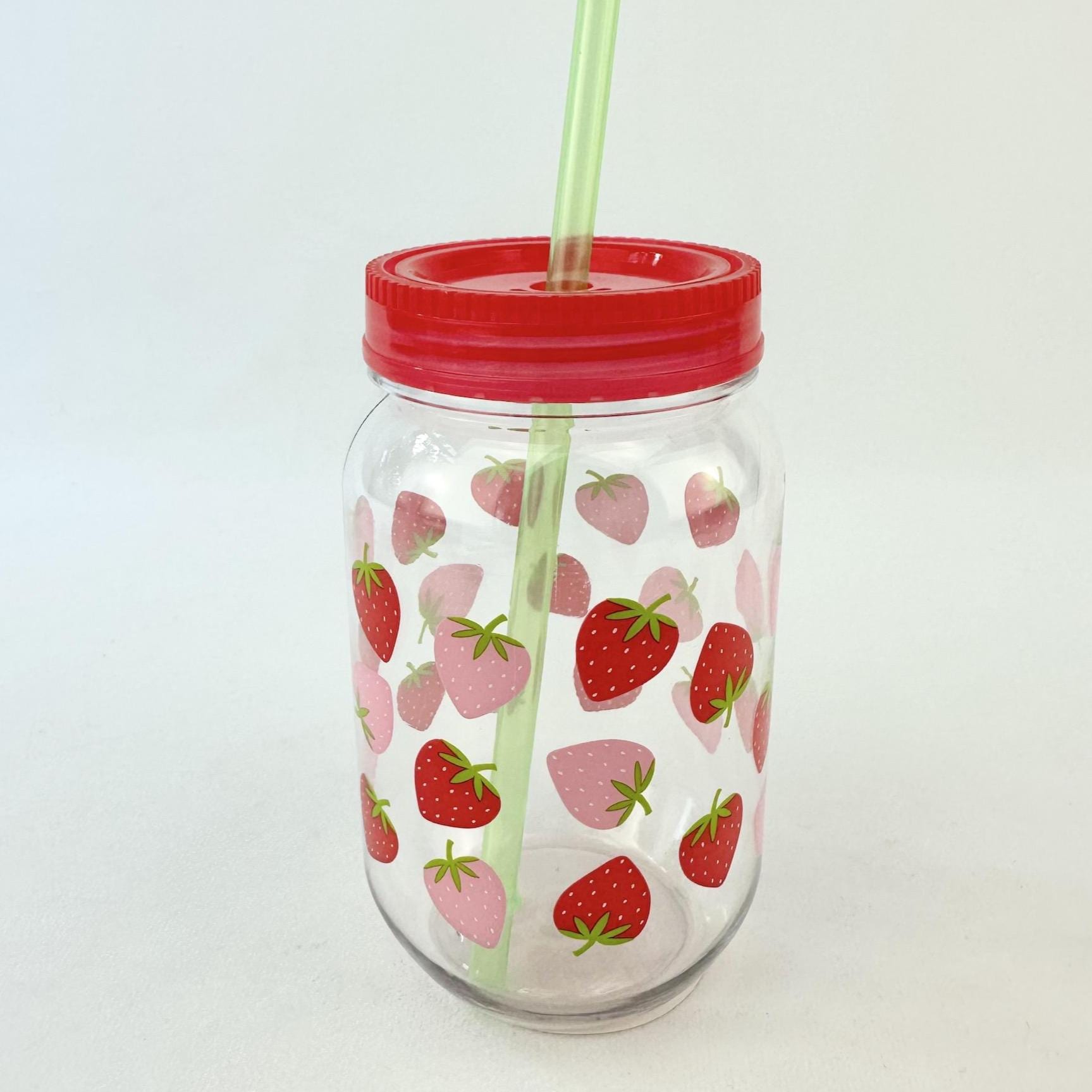 Sweeten your party beverages with our reusable plastic Strawberry Jar Cup adorned with a charming pink & red strawberry print and a convenient green plastic straw. Perfect for summer parties, picnics, fruit birthdays, and everyday use, this reusable cup combines vintage mason jar style with playful strawberry designs. Made from durable, high-quality plastic, it ensures long-lasting use and easy cleanup. The included straw makes sipping your favorite beverages a breeze while adding a touch of fun to your table setting. Enjoy a refreshing drink in style with this adorable strawberry mason jar cup!