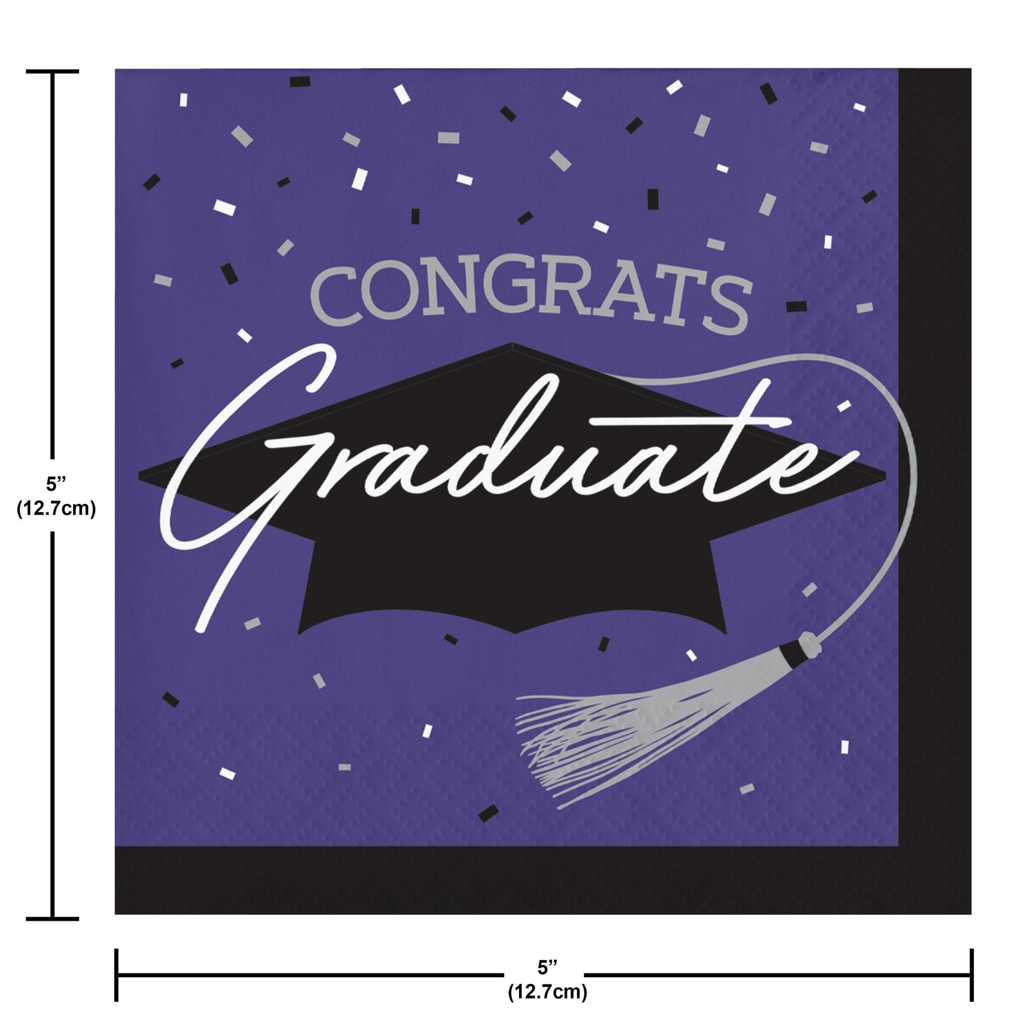 Celebrate the big achievement with these Purple Graduation Party Napkins! Featuring a dark purple background, a sleek black border, and the message "Congrats Graduate," these napkins are the perfect way to add a festive touch to your celebration. A black graduation cap and playful confetti accents complete the design, making them ideal for both decoration and clean-up. Perfect for graduation parties of any size, these napkins bring both style and practicality to your event.