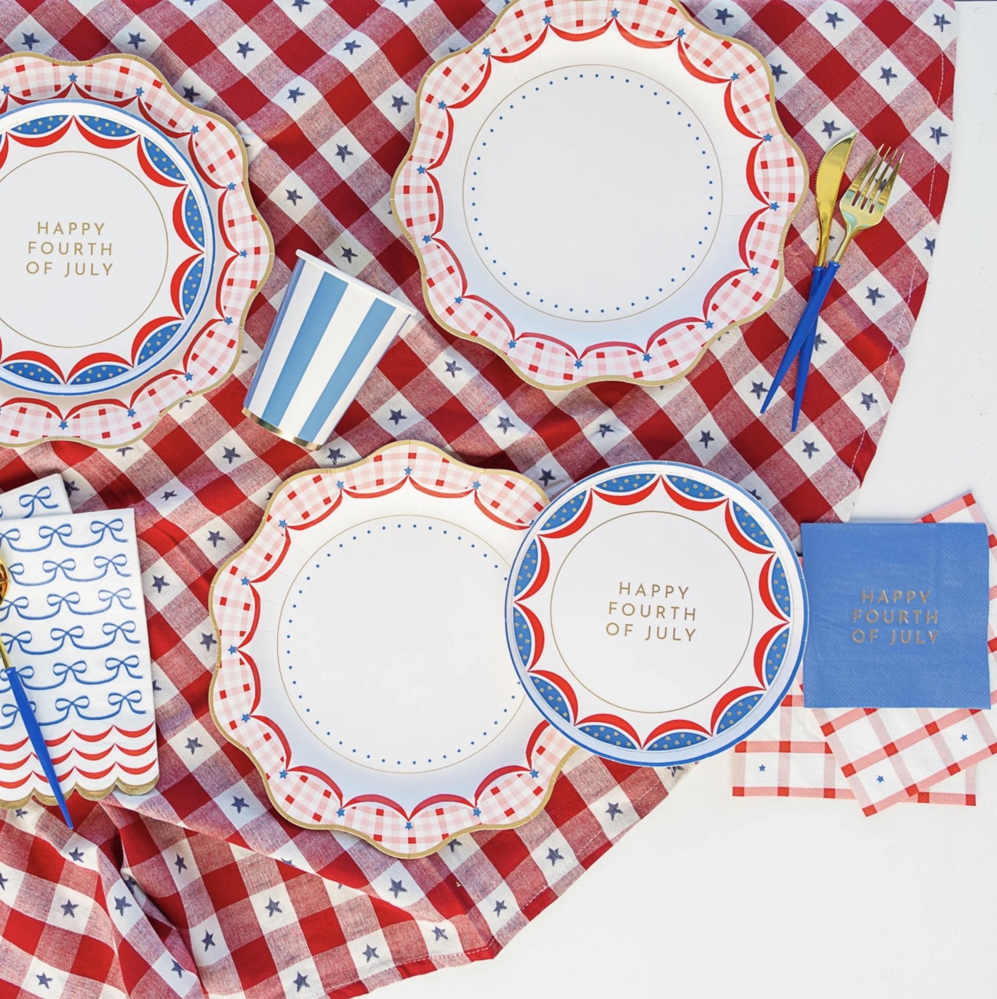 Add a touch of elegance to your patriotic celebration with these Red, White & Blue Bows Dinner Napkins! Featuring a crisp white background, these napkins showcase rows of delicate blue bows gracefully connected across the design. Below, a draping red banner adds a festive touch, perfectly complemented by a shimmering gold foil scalloped edge. Whether you're hosting a Fourth of July barbecue, a Memorial Day picnic, or any patriotic gathering, these guest towel napkins bring a sophisticated and celebratory charm to your table.