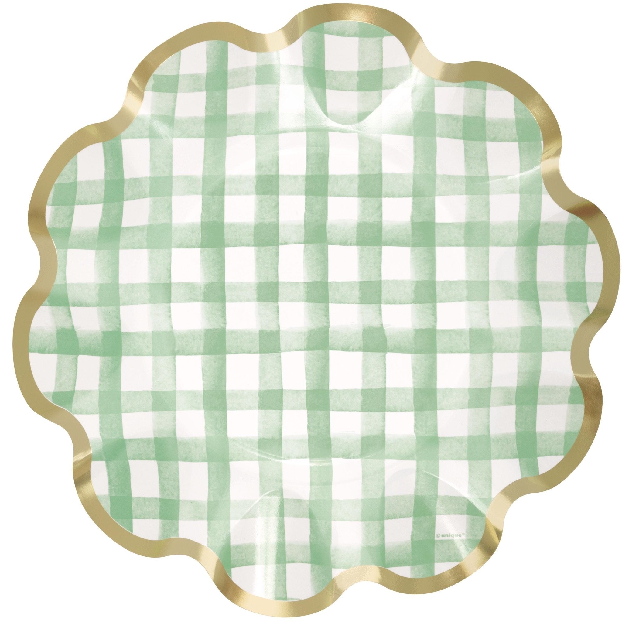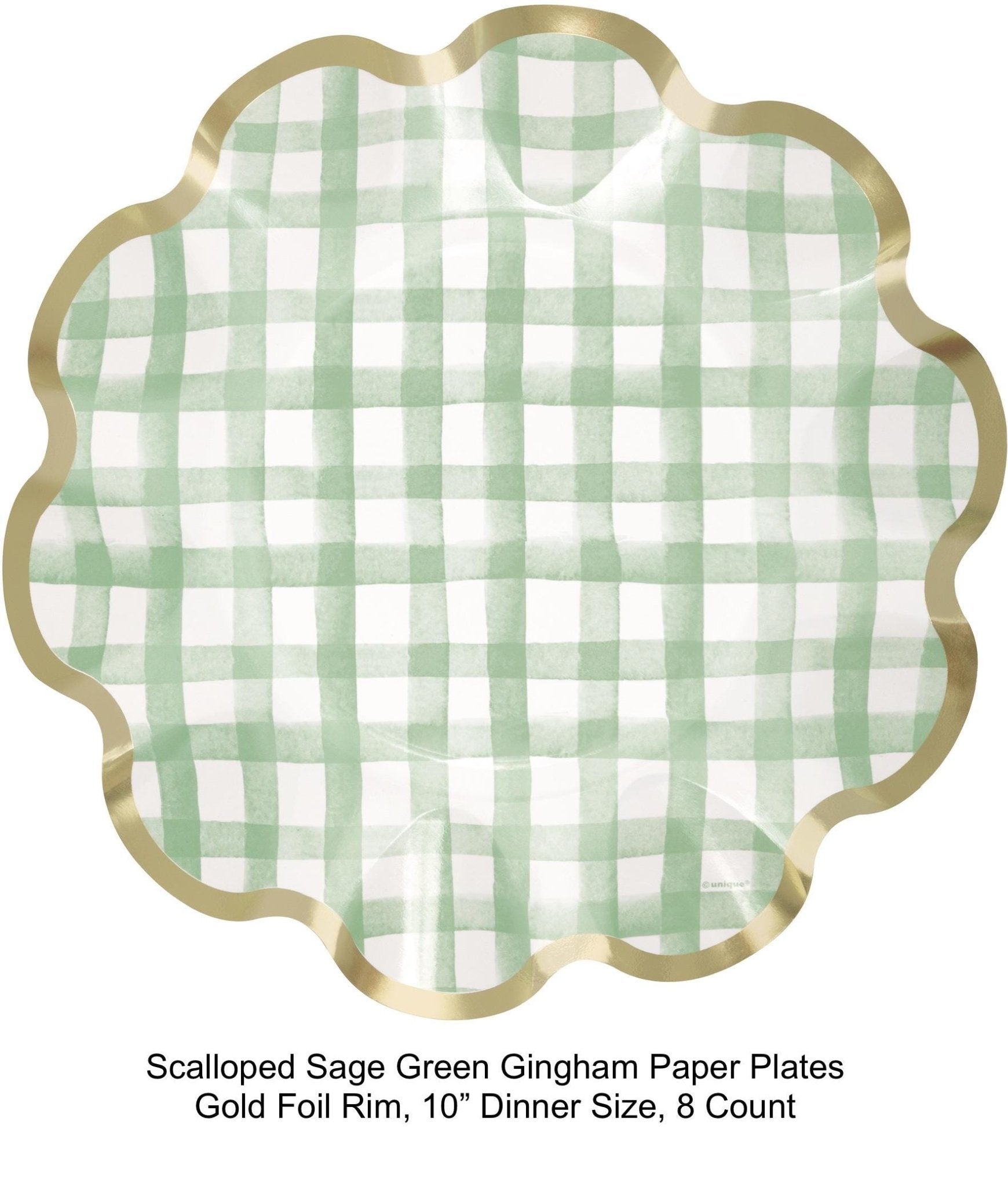 Serve up style with these charming green and white gingham dinner plates! Featuring elegant scalloped edges and a touch of gold foil, they're perfect for picnics, parties, showers, birthdays, and special gatherings. Sturdy, stylish, and disposable for easy cleanup!