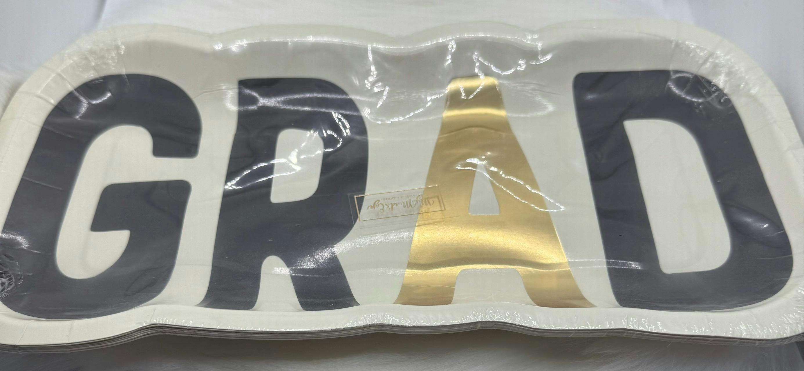 Make a bold statement with these oversized "GRAD" plates! Perfect for serving up meals or snacks, these large paper plates double as decor on your food or dessert table. With a modern black, white, and gold foil design, they’re a must for high school and college graduation celebrations.