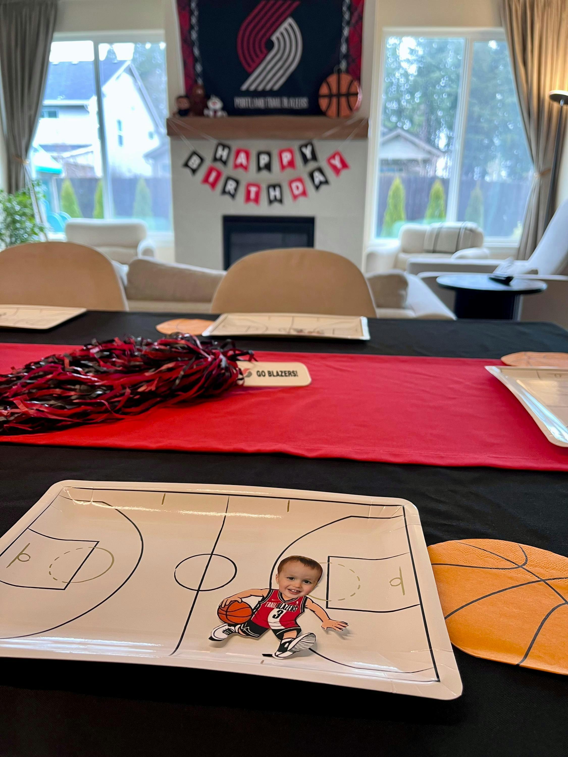 Elevate your basketball-themed party with our set of 8 Basketball Paper Plates! These large rectangular plates, measuring 11" x 7.25", are shaped like a basketball court, bringing the excitement of the game to your table. With a creamy white background, black lines, and stylish gold foil accents, they add a touch of championship flair to any event.