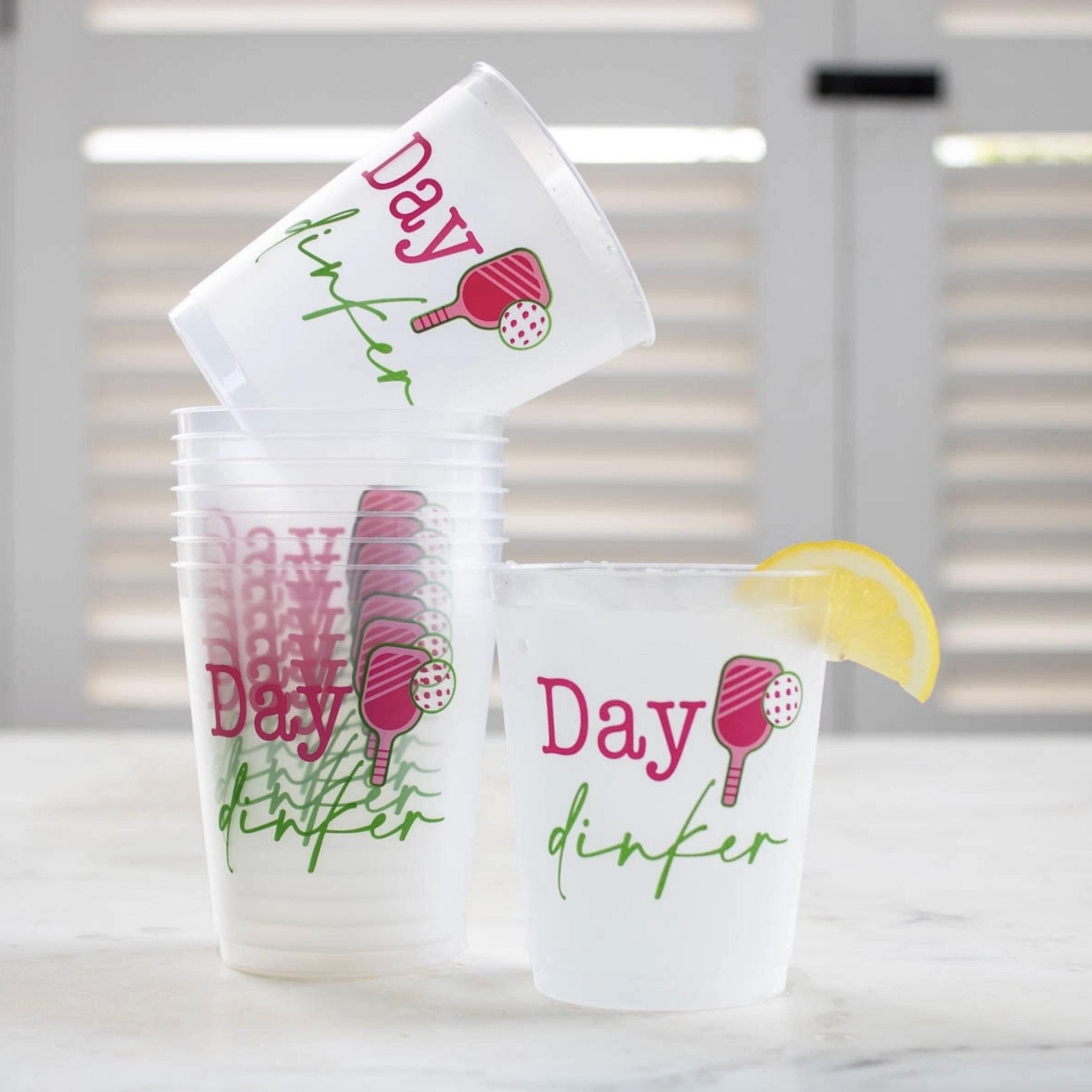 Serve up some fun with our Day Dinker Pickleball Party Cups! These frosted plastic cups feature the playful phrase "Day Dinker" in vibrant pink and green, paired with a cute pickleball paddle and ball graphic. Whether you're hosting a pickleball-themed event or a lively outdoor gathering, these reusable drink cups add a spirited touch to your party. Perfect for serving drinks at your next game day or summer celebration, these cups are both functional and full of personality.