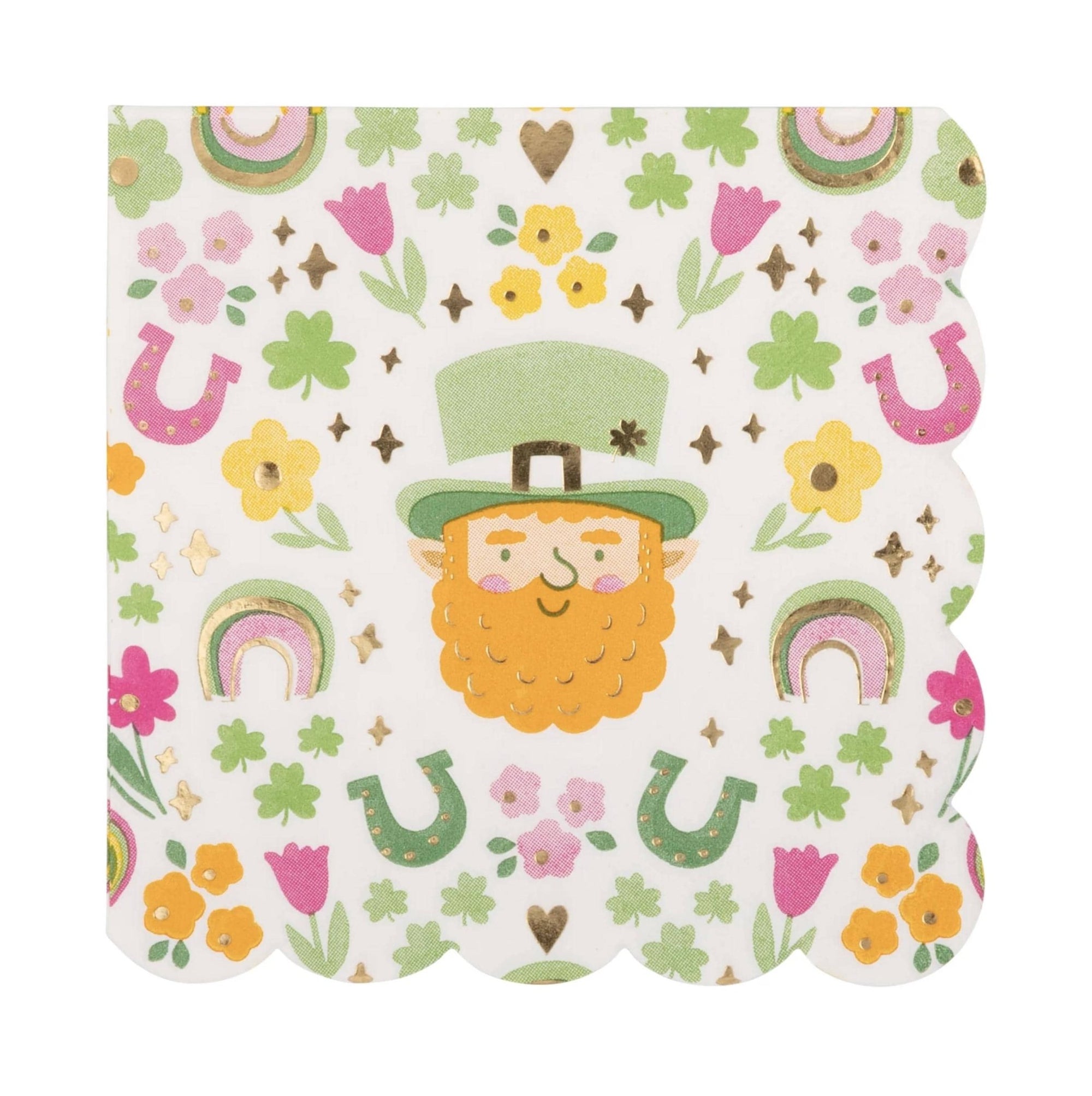 Make your St. Patrick’s Day celebration extra festive with these delightful Leprechaun Party Napkins! Featuring a cheerful leprechaun surrounded by clovers, rainbows, horseshoes, and stars, these scalloped paper napkins add a whimsical touch to your party decor. Gold foil accents bring a bit of shimmer, making them perfect for serving drinks, snacks, or desserts in style. Whether you're hosting a lucky-themed party or a fun family gathering, these napkins are sure to spread joy and charm. Add a magical touch to your celebration with these festive beverage napkins!