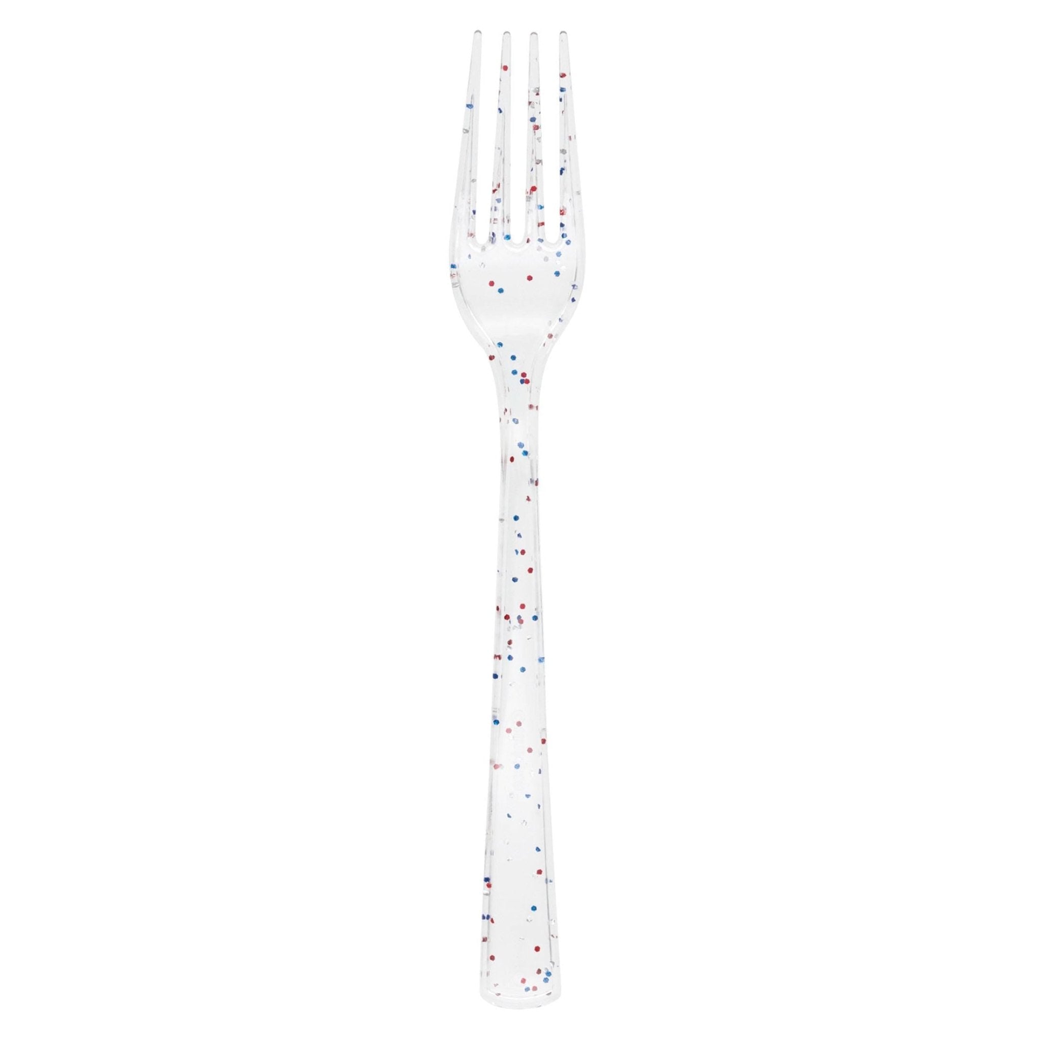 Serve up serious sparkle with these red, silver, and blue glitter forks! Each clear plastic fork features festive glitter inside the handle—perfect for 4th of July picnics, Memorial Day cookouts, or any patriotic celebration. With 18 in every pack, they’re sturdy enough to hand wash & reuse, and cute enough to display at your party table.