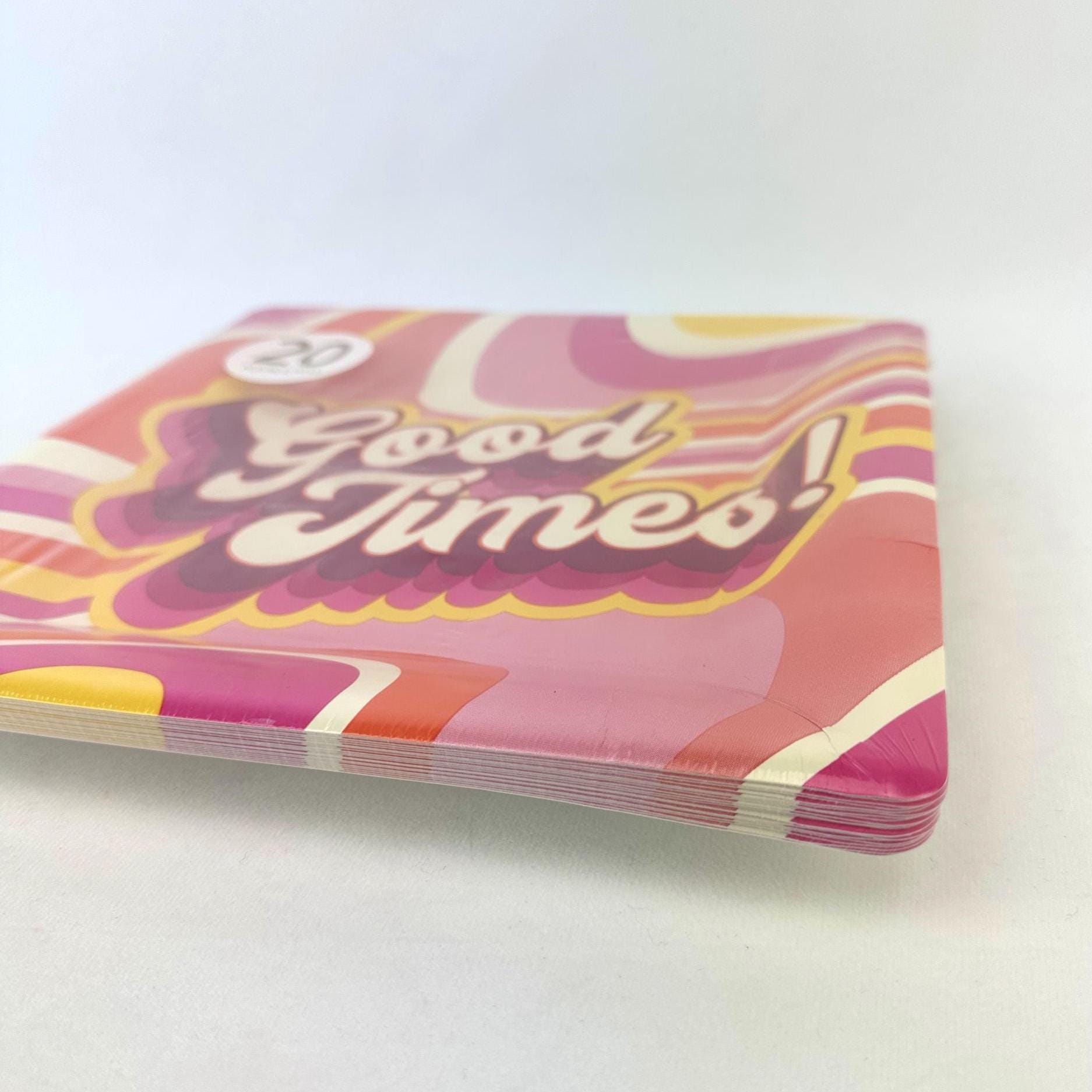 • Design: "Good Times!" text with retro swirl in pink, orange, and yellow