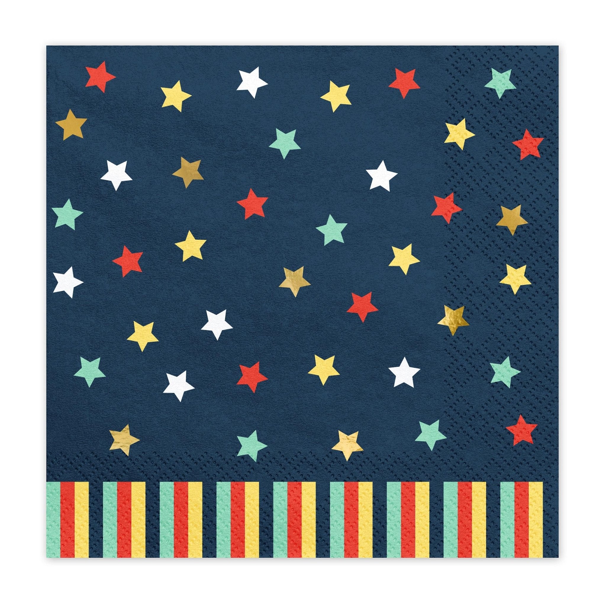 Add a whimsical touch to your celebration with these Sky-Themed Paper Luncheon Napkins. Featuring a dark blue background with a striped border and vibrant red, yellow, white, mint, and gold foil stars, these napkins are a fun and stylish addition to your table setting. Perfect for coordinating with any party theme, they bring a pop of color and charm to birthdays, baby showers, or any event with an aviation or celestial theme. These napkins offer both elegance and practicality, making them an ideal choice for your next gathering.