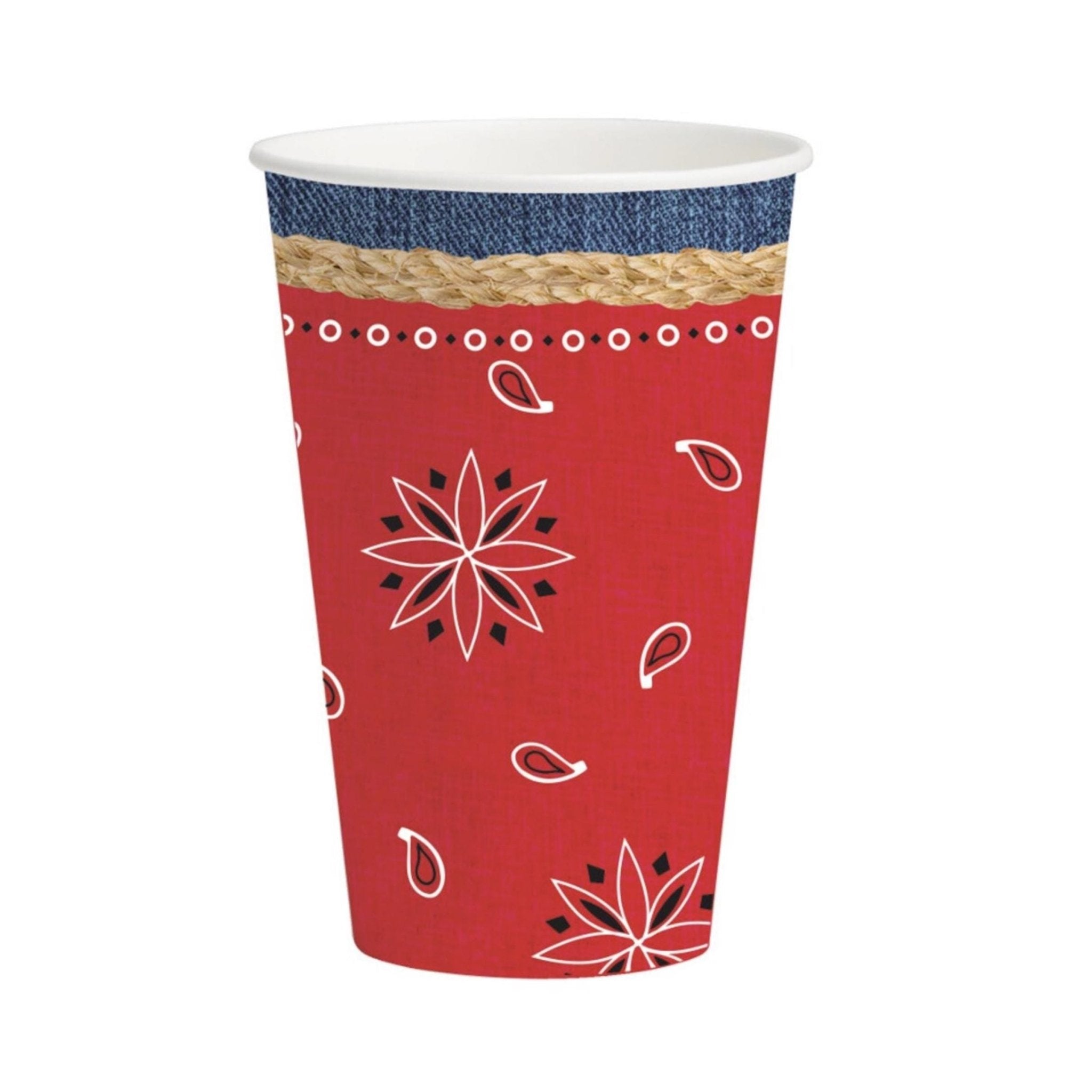 Serve up drinks in style with these Western Bandana Cups! Featuring a bold red bandana pattern, these disposable paper cups are accented with a rope design and a denim blue jeans pattern near the top, adding a rustic touch to your wild west-themed celebration. Perfect for cowboy or cowgirl parties, BBQs, farm & country themed parties, or any rustic gathering, these cups bring both flair and function to your party.