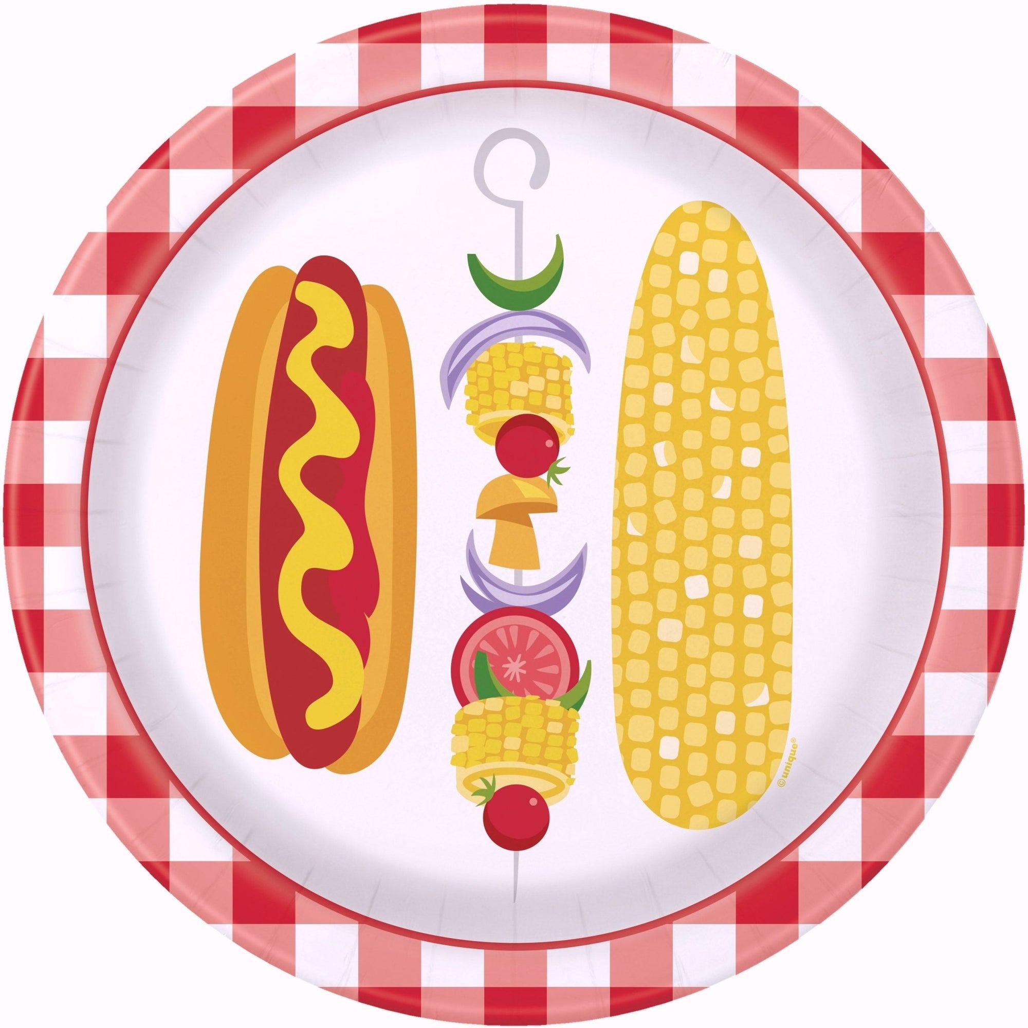 Bring homestyle charm to your next backyard barbecue with our Cookout Party Paper Plates! Featuring a classic red gingham rim and images of a hot dog, shish-kabob, and corn in the center, these plates are perfect for serving up your favorite grilled treats. Each pack includes 8 dinner-sized plates, designed to add a fun and festive touch to your picnic or cookout. Whether you're grilling burgers or enjoying sides, these plates will enhance your outdoor celebration with style and convenience!