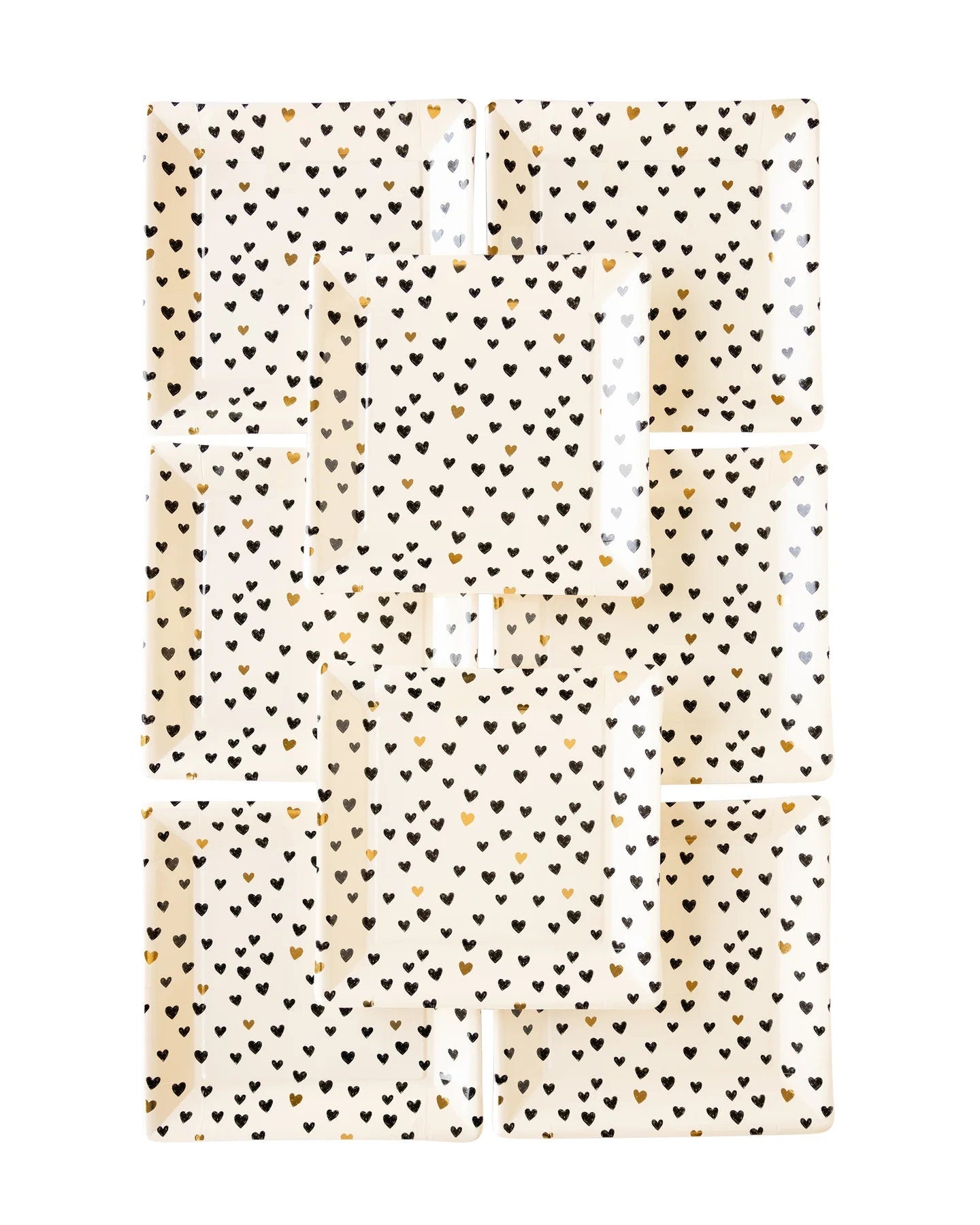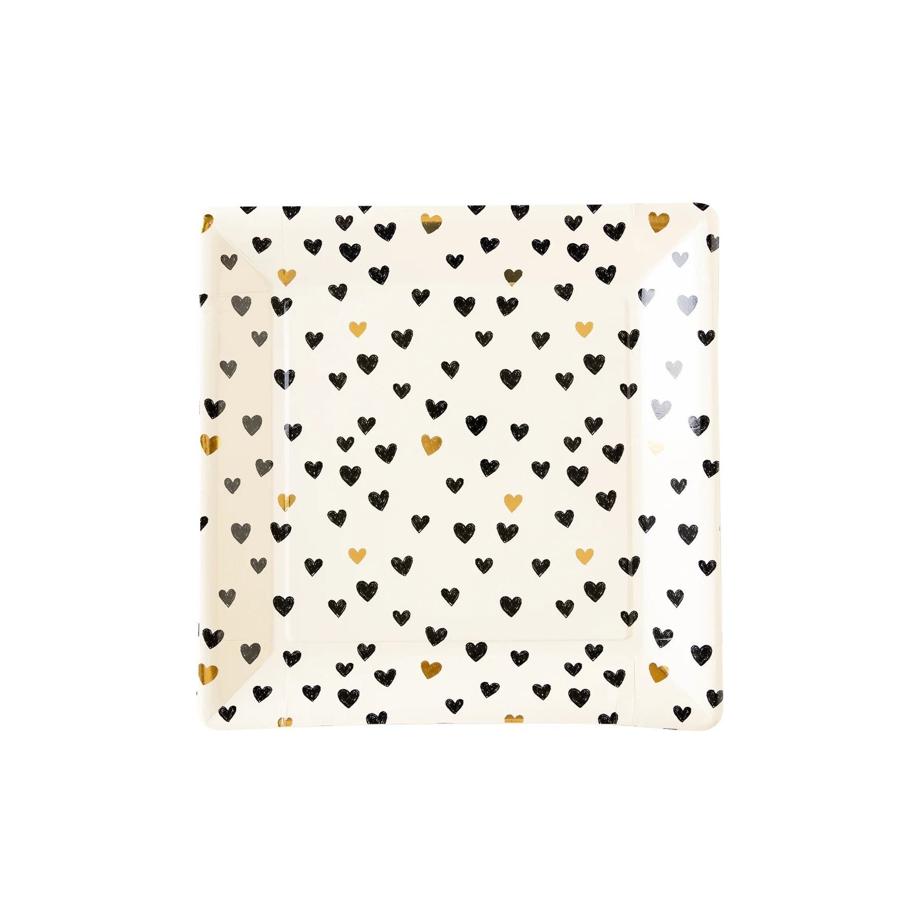 These plates bring a touch of glamour to any event, adding a chic and modern element to your table setting. These large square plates have black and gold foil hearts on a cream background. They are designed to make a statement, enhancing the overall aesthetic of your party decor. Use them for a bridal shower, wedding, engagement party, or Valentines Day celebration.