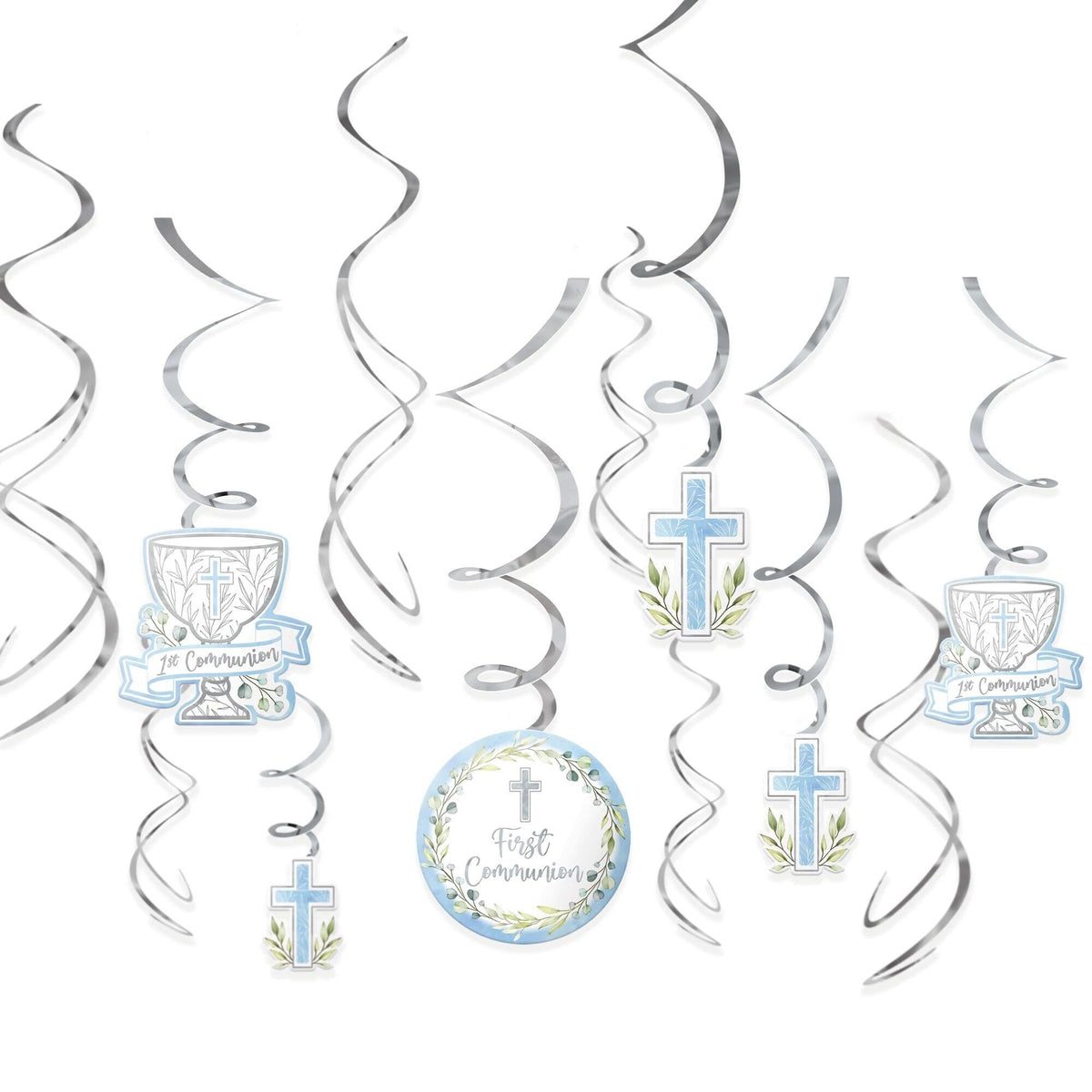 These charming decorations feature symbols of faith and joy, adding a reverent and celebratory atmosphere to the occasion. Hang them with care to create a visually appealing backdrop, marking this significant moment in a boy's spiritual journey. This set of 12 hanging decorations include silver foil swirl danglers and paper cutouts with a first communion theme included crosses, greenery, and communion cups. Perfect for complementing any First Communion party theme, these decorations promise to adorn the venue with grace and meaning, ensuring a memorable and heartfelt celebration for all.