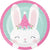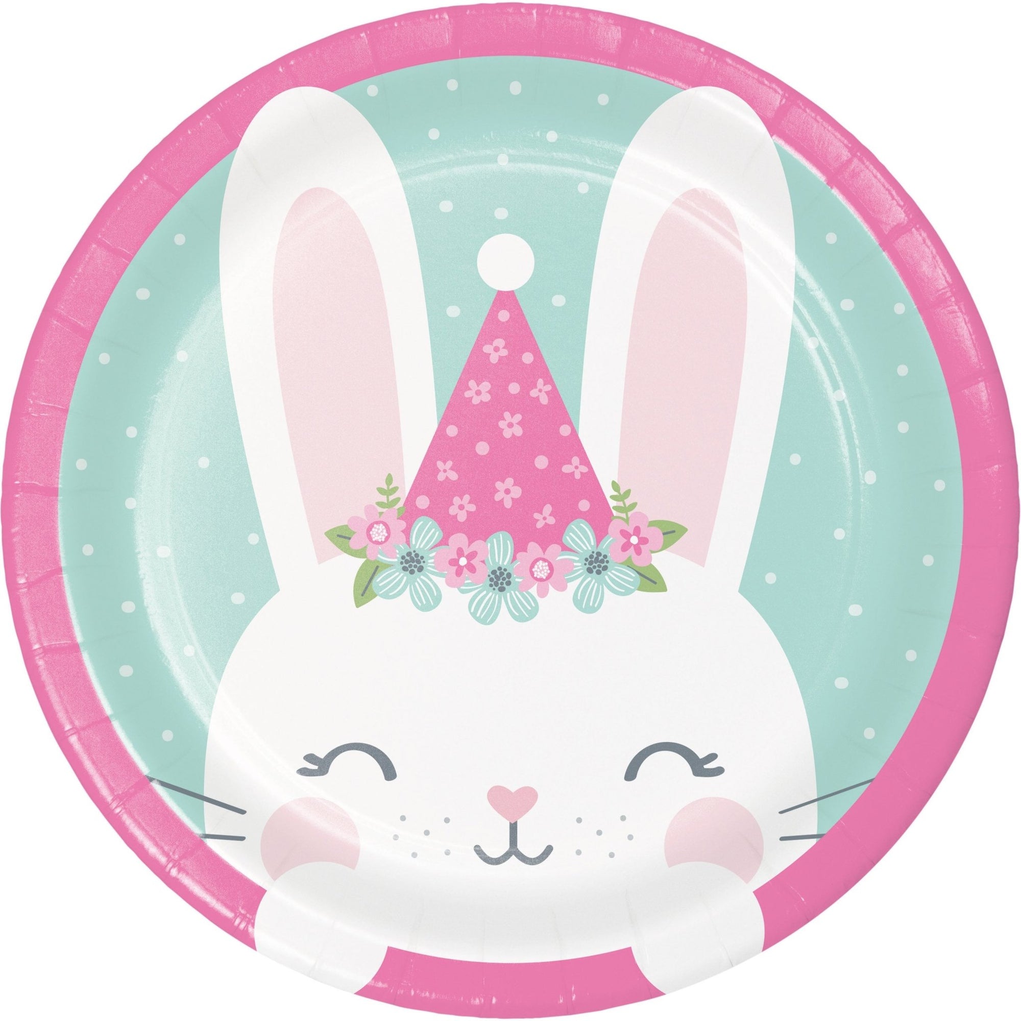 These cute pink, white and mint bunny plates are perfect for serving cake and appetizers to your shower and birthday party guests! The most adorable white bunny rabbit is topped with a cute floral party hat on a mint polkadot background with a pink trim. These plates are truly a special addition to your bunny party decor!