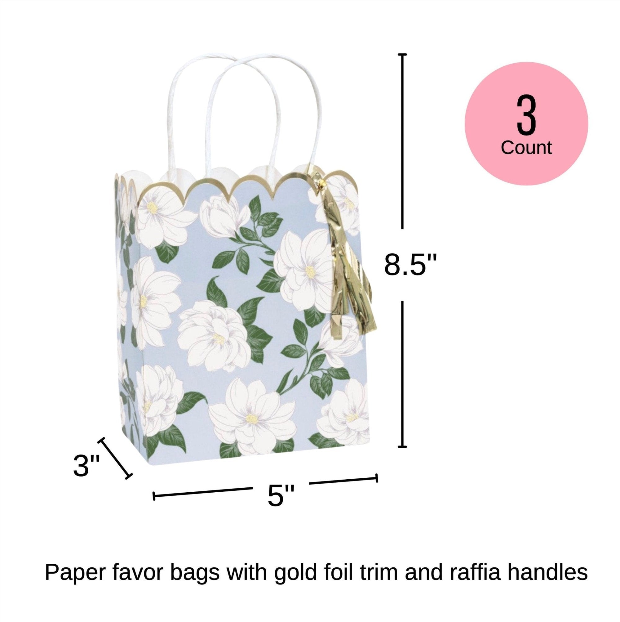 Add a touch of elegance to your floral-themed bridal shower with our exquisite paper favor bags. Adorned with delicate white flowers and accented with shimmering gold foil trim, these bags are the epitome of sophistication. The charming raffia handles provide a rustic yet refined finishing touch, perfectly complementing any garden-inspired celebration. Elevate your guests' experience with these stunning favor bags, sure to leave a lasting impression of your special day.