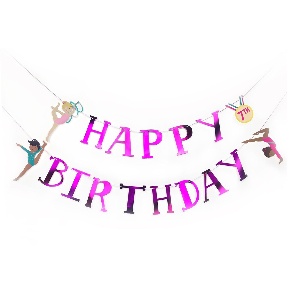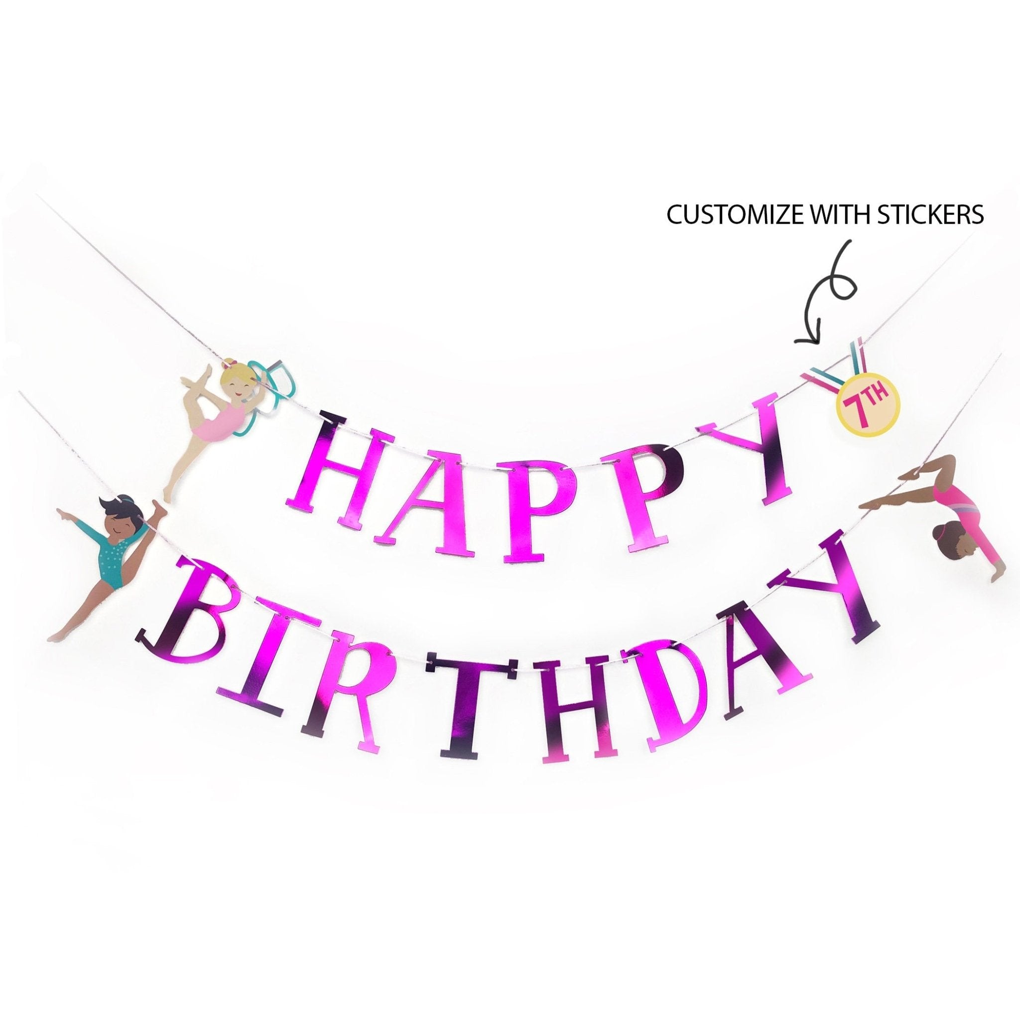 Add a personalized twist to your gymnastics-themed birthday extravaganza with our customizable Happy Birthday banner and age stickers. Raise the excitement as you showcase your young gymnast's age in style, making the celebration truly unique. Make every flip and tumble unforgettable with this vibrant and energetic party decoration that will have everyone cheering for an amazing day of fun and festivity!