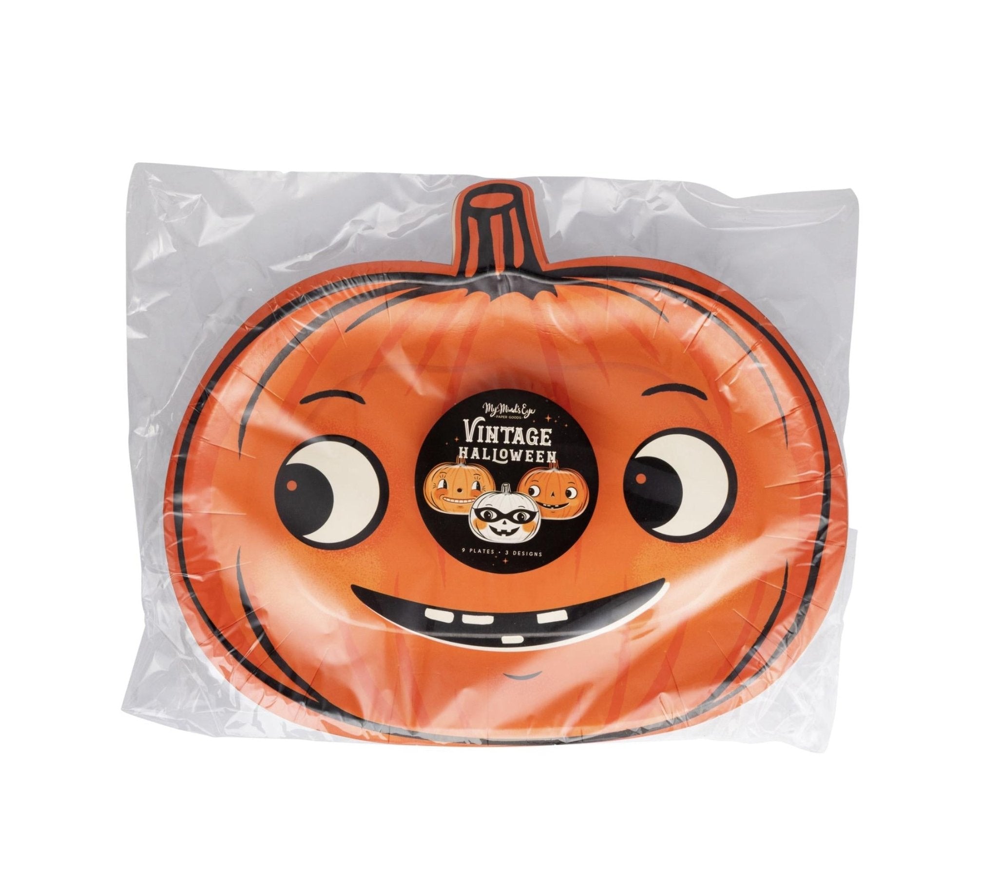 Serve up spooky fun with these vintage-inspired Halloween pumpkin paper plates! Each set includes 9 large shaped plates featuring an assortment of 3 playful jack-o-lantern faces in orange and white — perfect for trick-or-treat parties, haunted house gatherings, and festive fall celebrations. Made from durable paper, these disposable plates keep cleanup easy while adding retro charm to your Halloween table.