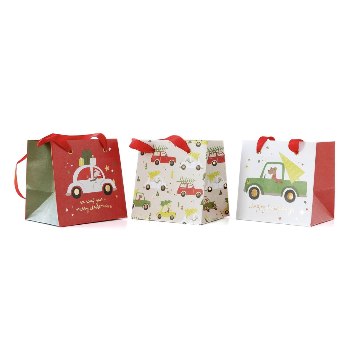Add a playful touch to your holiday gifting with our Dog Christmas Gift Bags! This charming set includes three unique designs: a poodle driving a red car with presents and the phrase "We Woof You a Merry Christmas," festive cars hauling Christmas trees in holiday hues, and a cheerful dog driving a green truck with the message "Happy Howlidays." Perfect for wrapping gifts, these bags bring whimsical charm and personality to any present. Ideal for dog lovers and holiday enthusiasts, they make every gift extra special and festive!