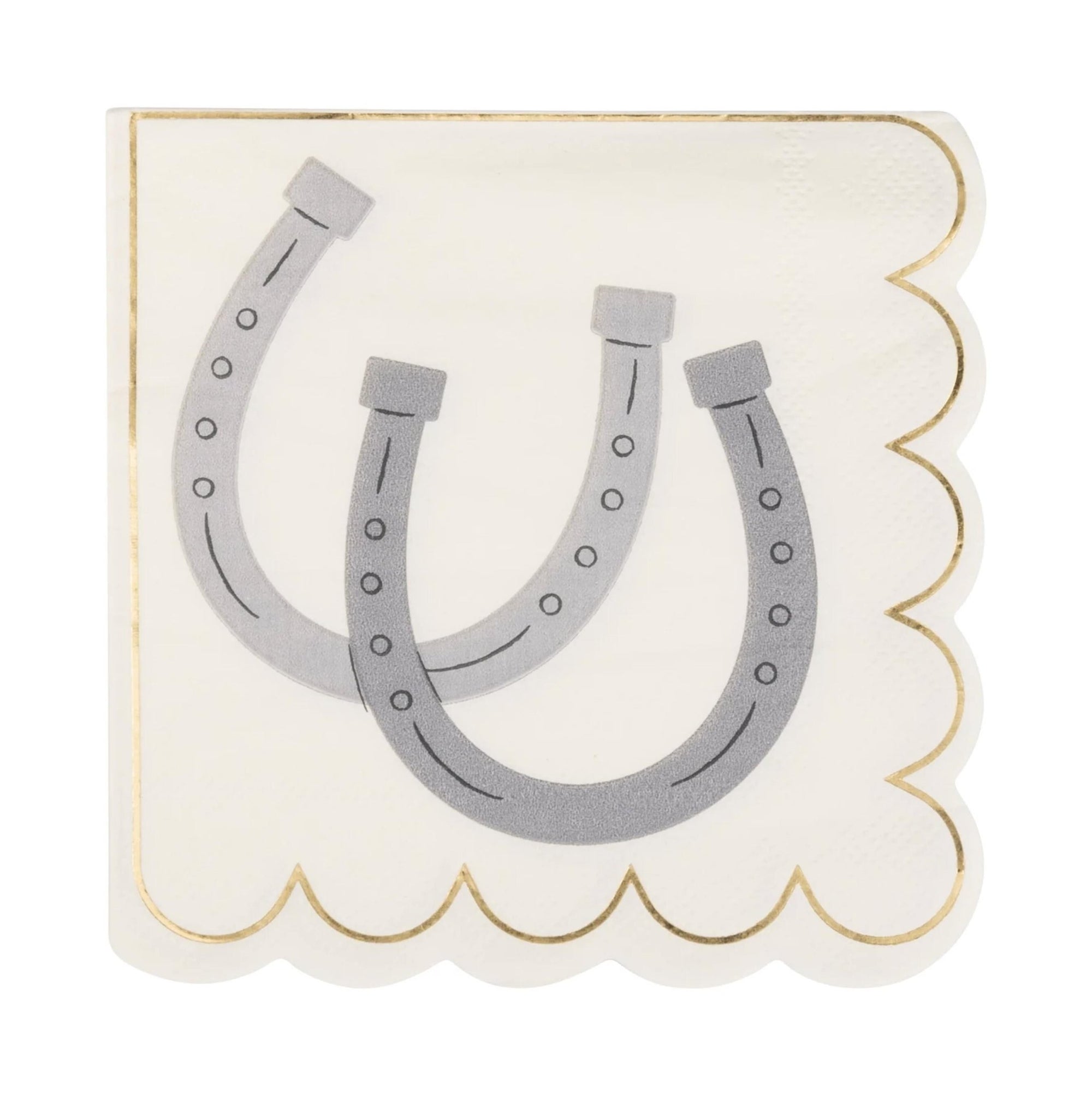 Bring a touch of luck to your celebration with Horseshoe Party Napkins! These creamy white napkins feature two elegant silver horseshoes at the center, complemented by a shimmering gold scalloped edge. Perfect for western-themed parties, rustic weddings, or howdy baby showers, or country themed birthdays, these cocktail napkins add a stylish and lucky charm to your table setting. Both decorative and functional, they’re ideal for serving appetizers, desserts, or cocktails with a touch of equestrian sophistication!
