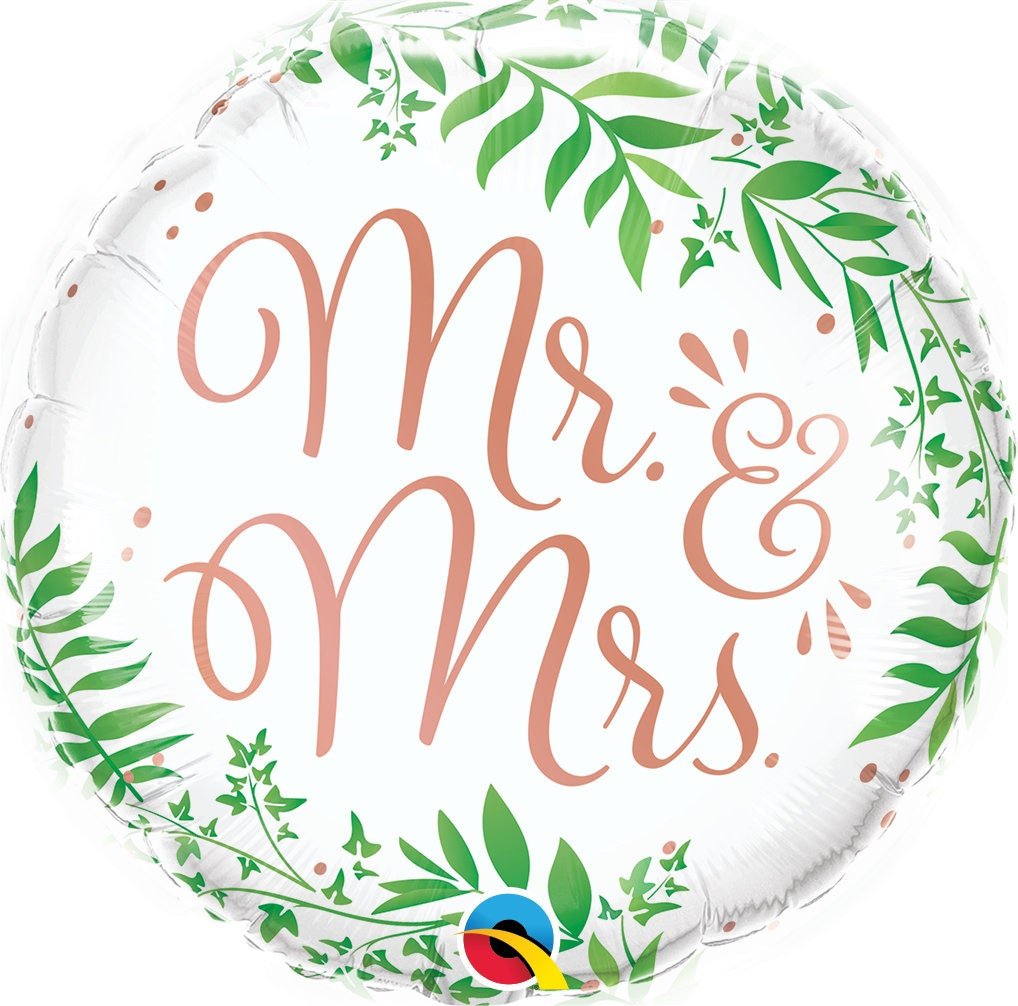 Add elegance and charm to your wedding or anniversary celebration with this stunning 18" round mylar balloon! Featuring delicate greenery and a sparkling rose gold "Mr & Mrs" script, this balloon is the perfect way to enhance the romantic atmosphere of your special day. Its sophisticated design adds a touch of sparkle and shine, making it a must-have decoration for any celebration. Celebrate in style and make your event unforgettable with this beautiful, eye-catching balloon.