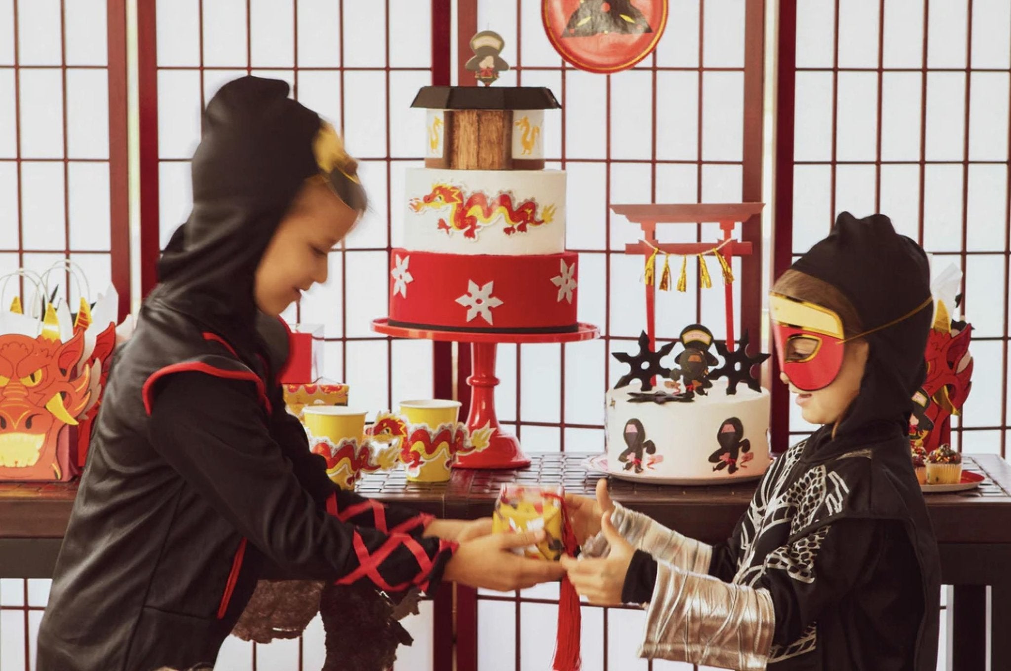 Complete your ninja-themed celebration with our Ninja Party Masks, in assorted bold red and black colors with yellow accents, gold foil detailing, and elastic bands. These paper masks are perfect for adding a touch of mystery and excitement to your event, allowing your little warriors to fully embrace their inner ninja. Ideal as party favors or costume accessories, they add a fun and adventurous element to birthdays or any ninja-inspired gathering. Let the ninja battles begin with these striking and stylish masks!