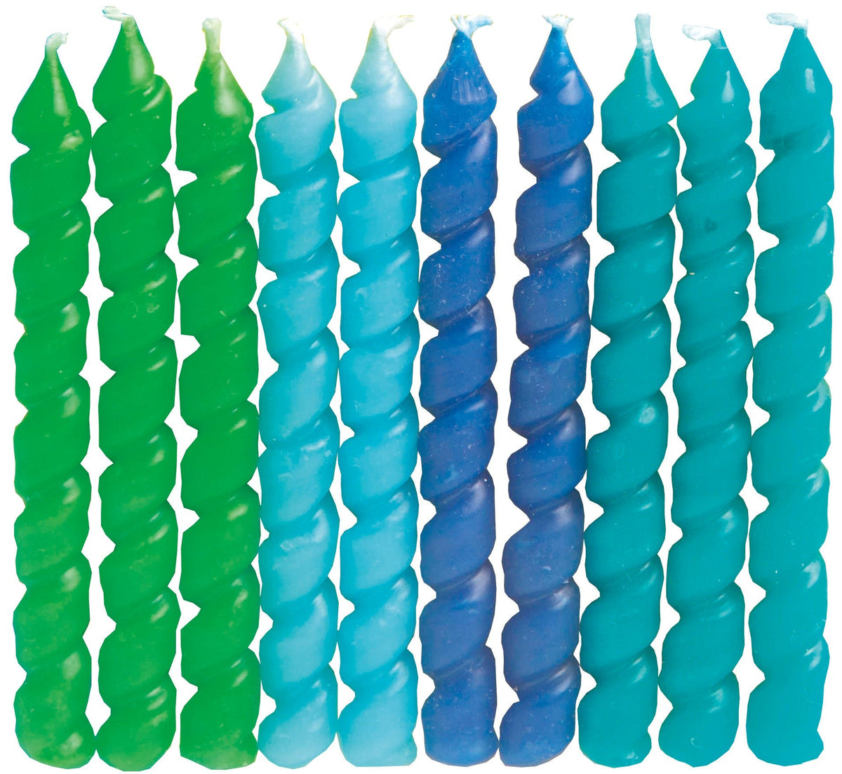 Add in this gorgeous mix of blue and green color to fancy up your delicious desserts! These cute spiral candles measure 3" tall and they're perfect for topping your cupcakes and cakes. With a mix of green, blue, navy and teal, these candles are perfect for your mermaid party, ocean birthday, or fiesta celebration!