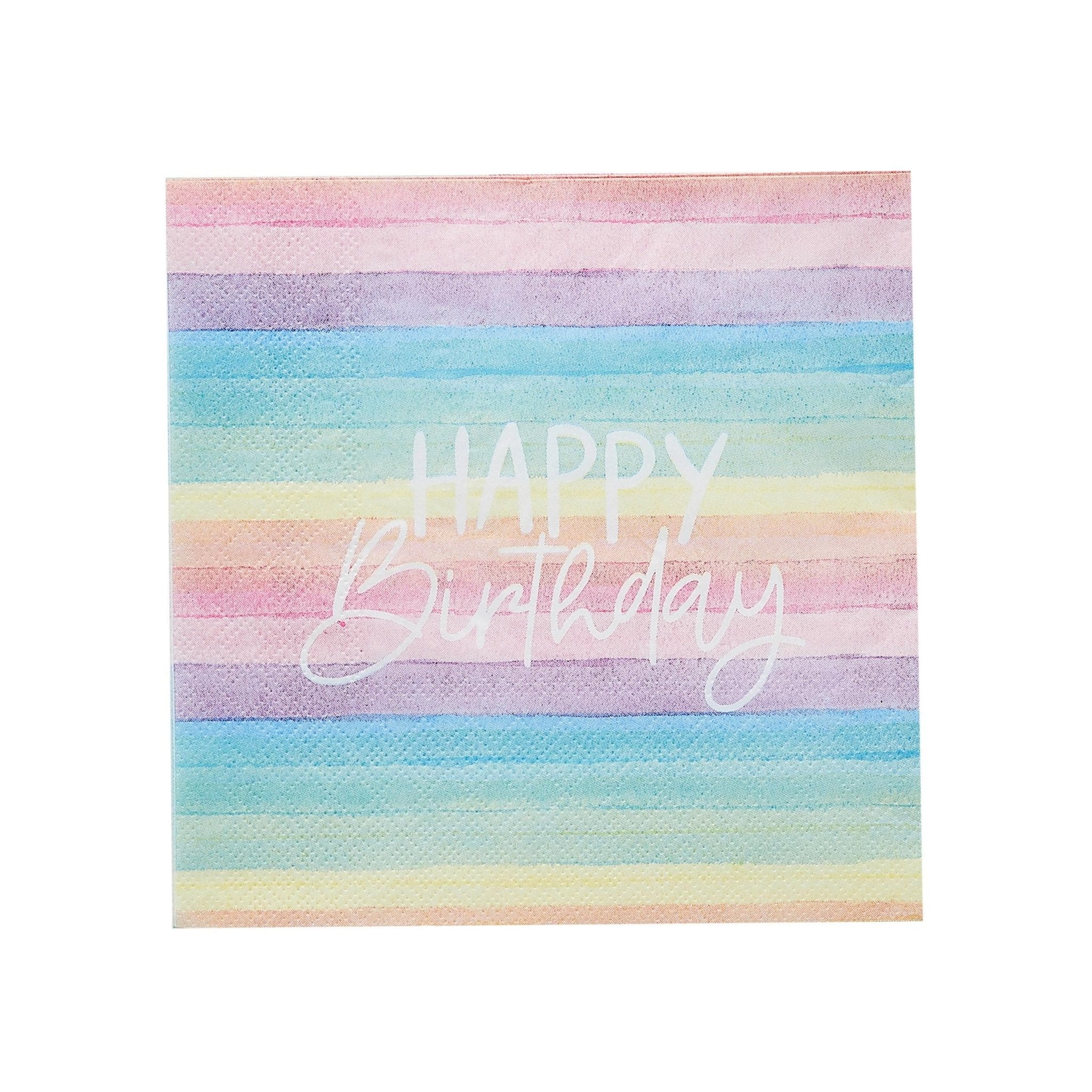Celebrate in style with these Pastel Rainbow Happy Birthday Napkins! Featuring a pastel rainbow stripe pattern across the background, these charming paper luncheon napkins read "Happy Birthday" in white text. Perfect for adding a festive touch to birthdays of all ages, they effortlessly combine practicality with playful design. Whether used for cake cutting or party snacks, these napkins are a cheerful way to keep your celebration clean and stylish.