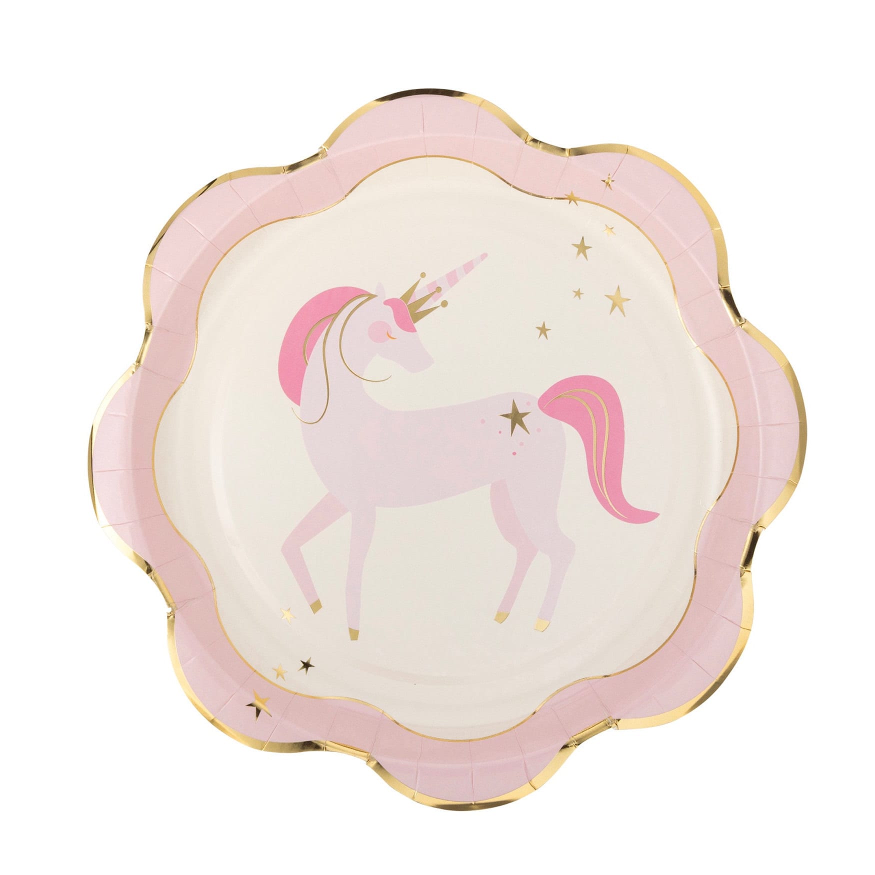 Bring a touch of magic to your celebration with our Magical Unicorn Party Plates! Perfect for princess or unicorn-themed birthdays and baby showers, these scalloped paper plates feature a whimsical unicorn design in soft pink hues with shimmering gold foil accents. Their elegant and durable construction makes them ideal for serving snacks, desserts, or meals while adding a dreamy charm to your table setting. Create a festive atmosphere that enchants guests of all ages with these beautifully designed disposable plates!