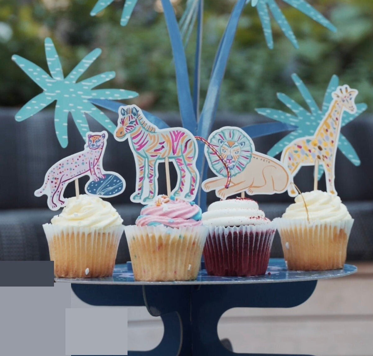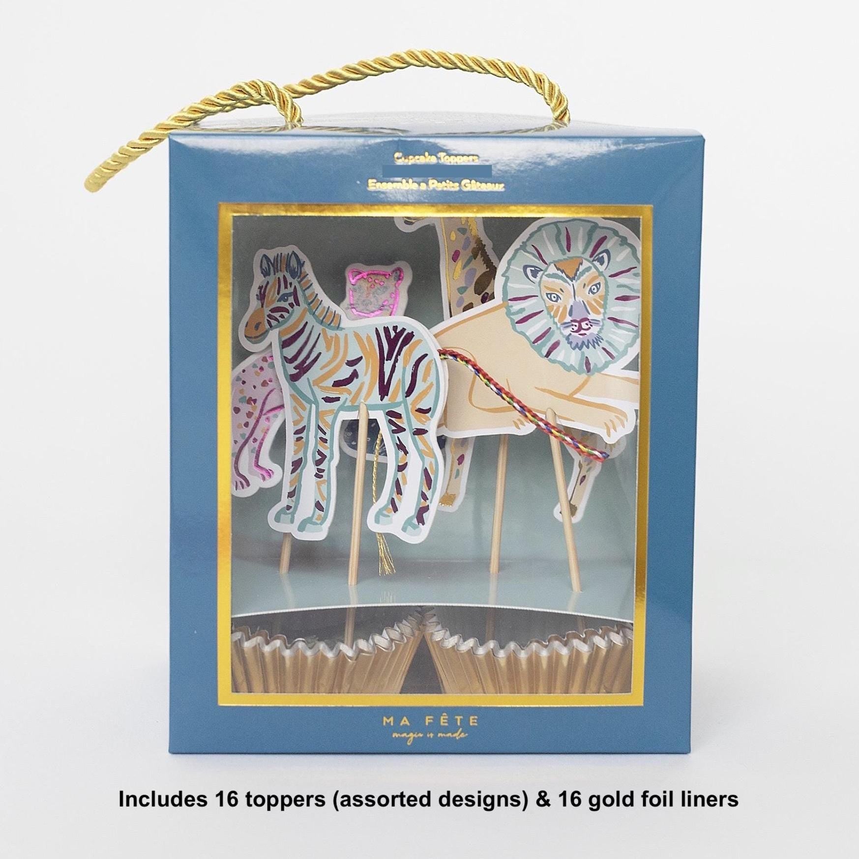 Bring the wild to your dessert table with our Safari Cupcake Toppers, featuring vibrant designs of giraffes, zebras, lions, and cheetahs. Perfect for jungle-themed parties or a safari adventure celebration, these toppers add a burst of color and excitement to your cupcakes. These paper toppers are a mix of blue, pink and beige colors, along with fuchsia pink and gold foil detailing; and the zebra and lions have corded tails! The toppers are on wooden sticks, and gold foil cupcake liners are included. This cupcake kit will help you capture the essence of the wild, making your treats the center of attention. Elevate your party desserts with these playful and exotic safari animal decorations!
