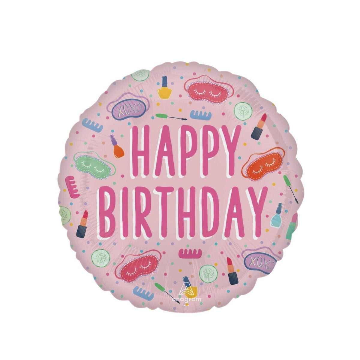 Set the scene for a relaxing and stylish celebration with this Spa Birthday Balloon! Featuring a soft pink background with "Happy Birthday" in bold pink lettering, this mylar balloon is adorned with fun spa-themed illustrations, including eye masks, nail polish, lipstick, combs, and cucumber slices. Perfect for a spa day birthday, makeup-themed party, or pampering celebration, this balloon adds a touch of glamour to your decor. Use it as a standout decoration or mix it with coordinating balloons for a picture-perfect setup. Bring the spa vibes to your party with this chic and playful balloon!