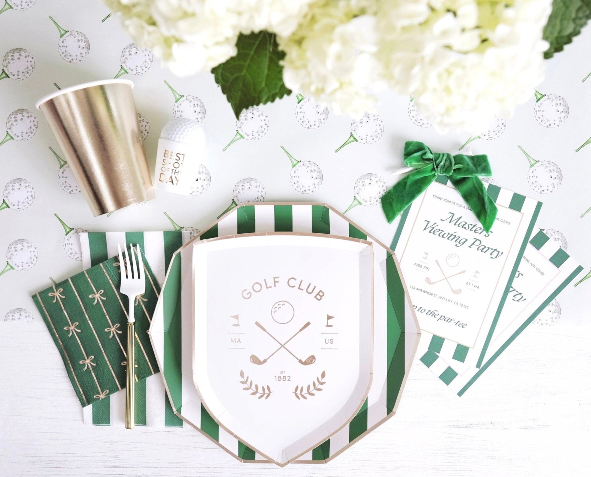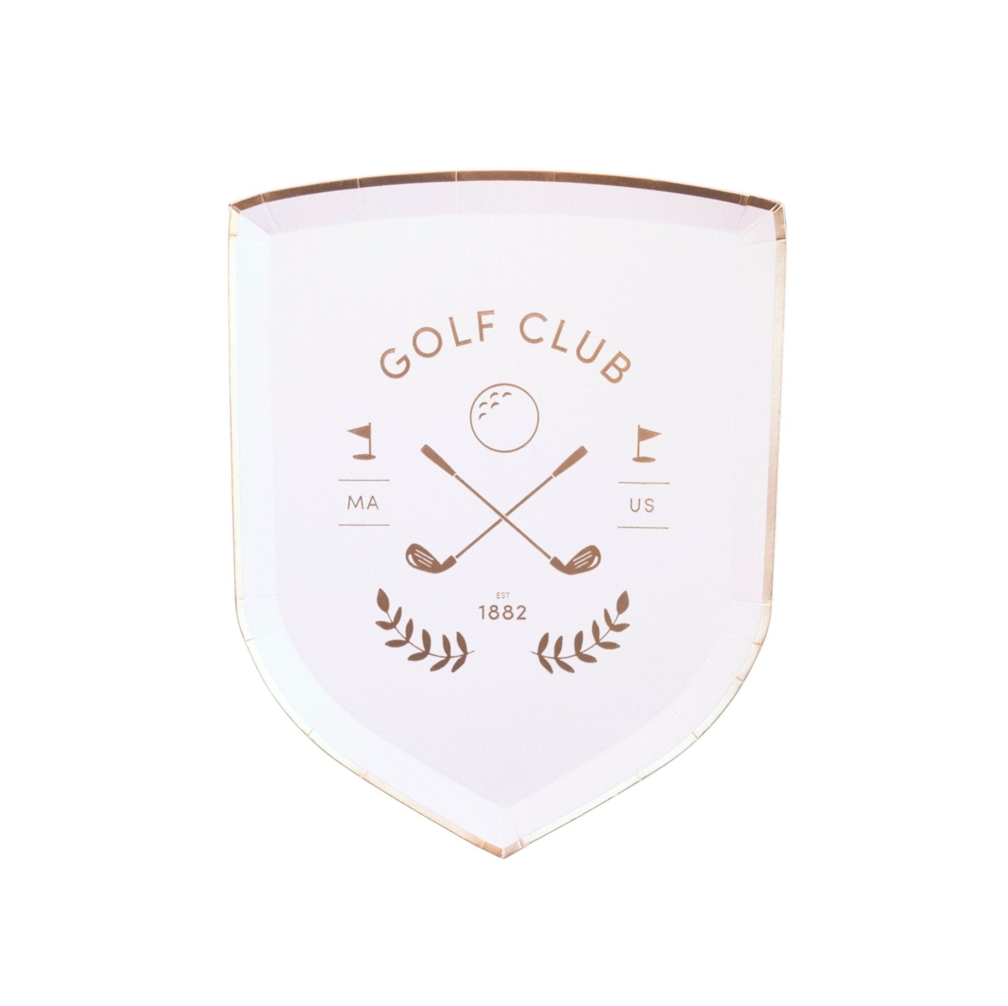 Tee up your celebration with our Golf Club Party Plates, designed in the shape of a crest featuring a golf ball above two crossing golf clubs, all accented in shimmering gold foil. These stylish plates are perfect for golf-themed birthdays, retirement parties, country club weddings, bachelor and bachelorette parties, or any event celebrating a love for the game. Their elegant design adds a touch of sophistication to your table setting while still being practical for serving snacks and treats. Elevate your party decor with these unique dessert plates that are sure to impress your guests!